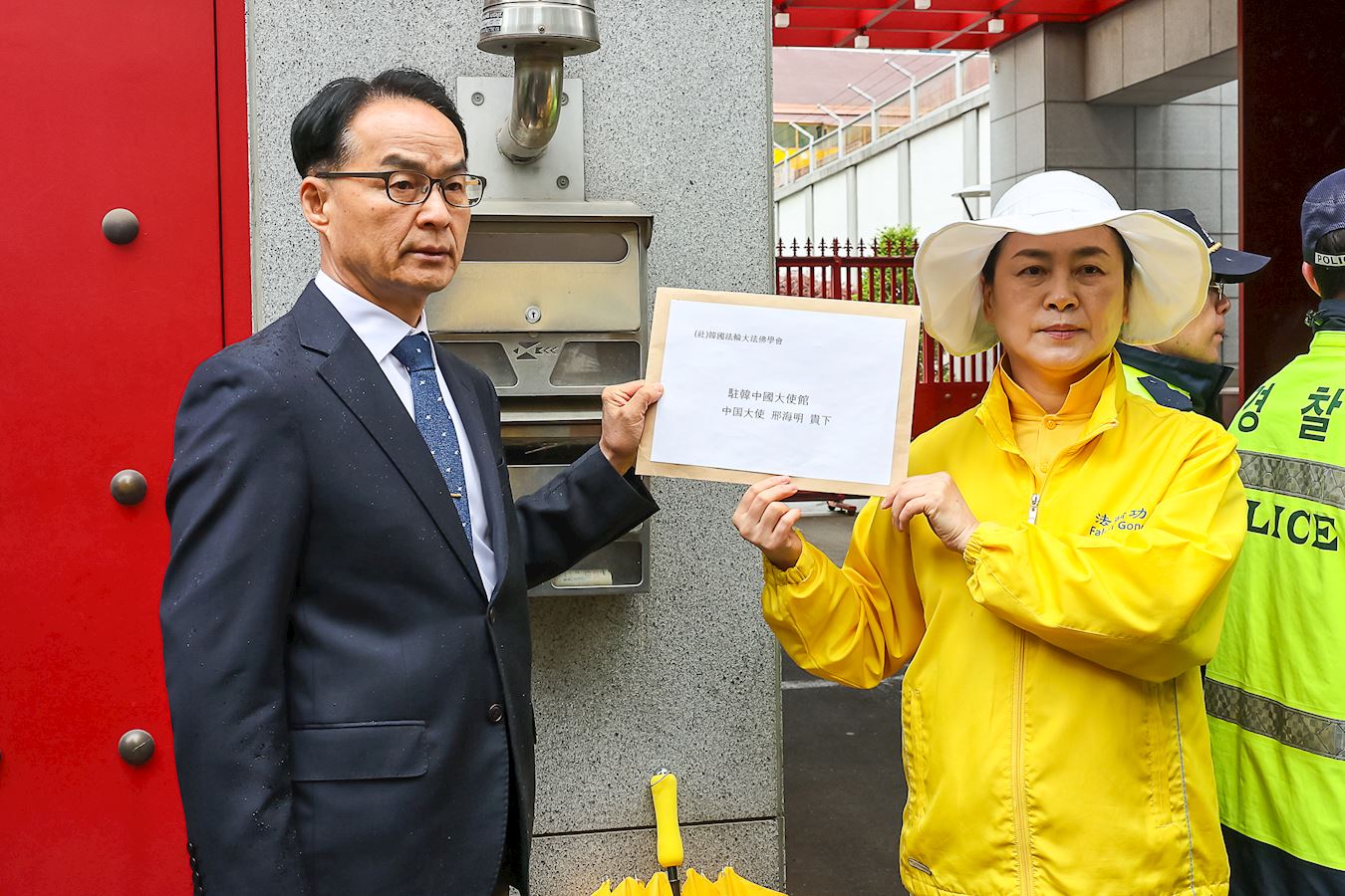 ![]() 图4:记者会后,韩国法轮大法佛学会向中国大使馆投递声明书。 |