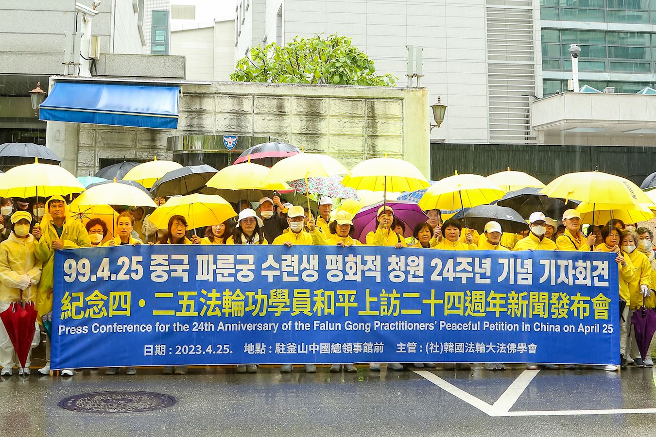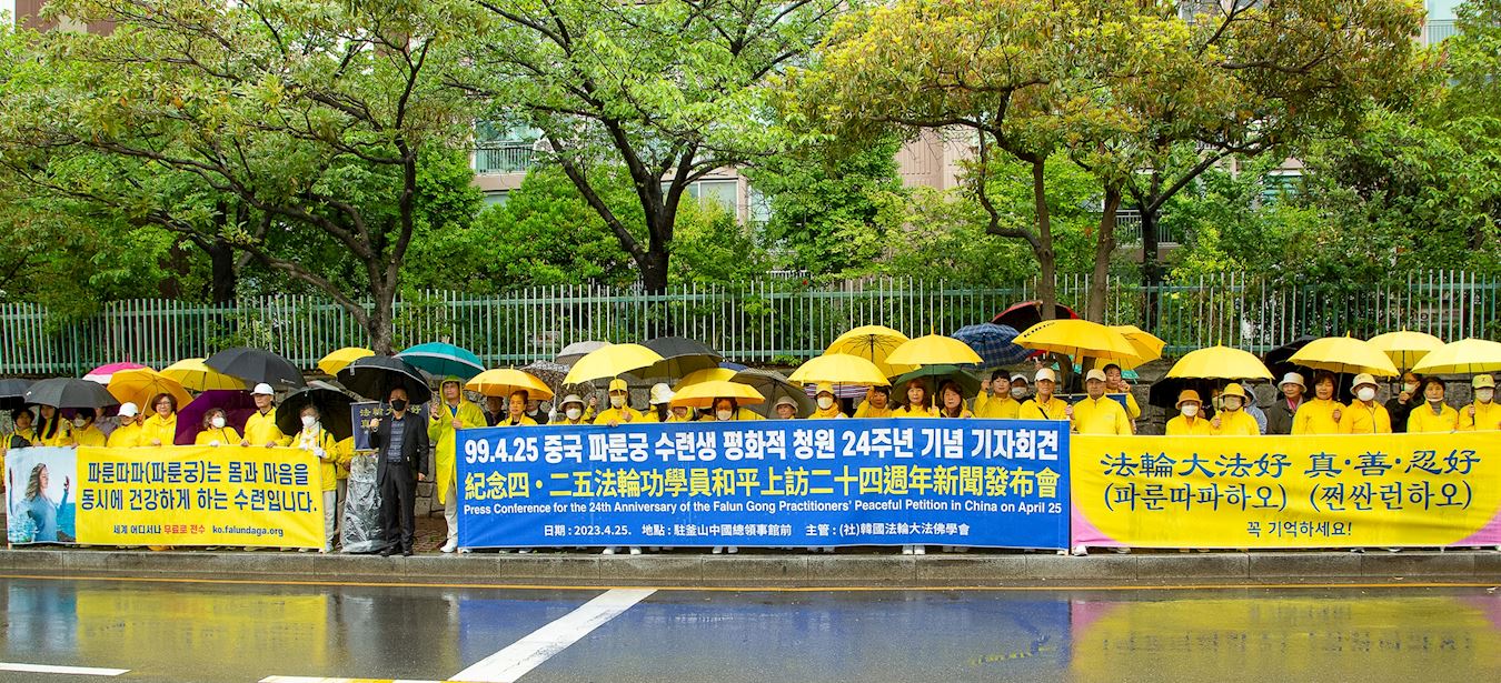 当天,来自釜山、大邱、蔚山、庆南等地部分法轮功学员在釜山总领事馆前纪念“四·二五”二十四周年。