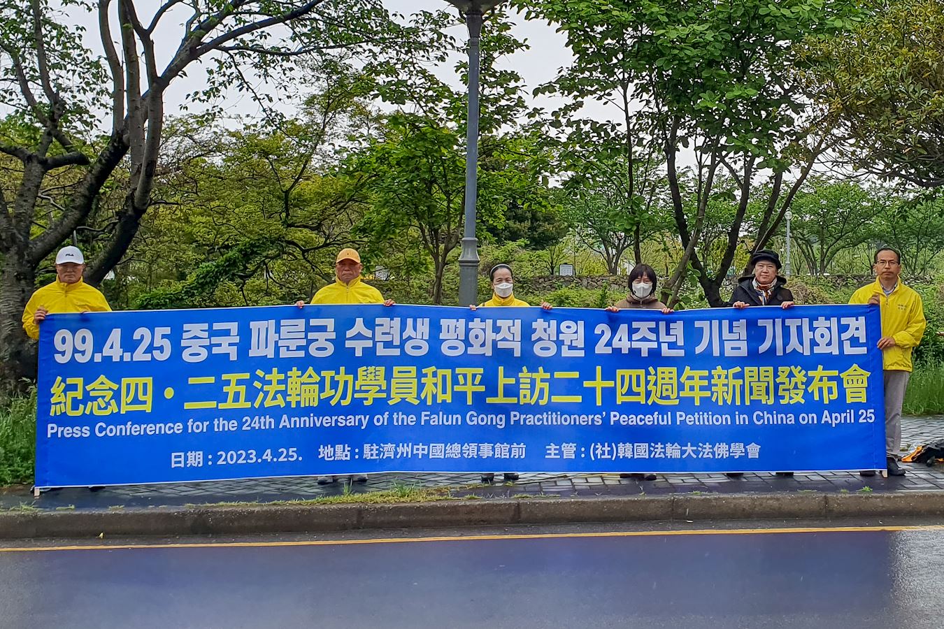 济州岛的情况是预计当天会下大雨,因此活动提前一天,二十四日下午召开了记者会。来自济州各地的学员们在中国驻济州总领事馆前举行纪念集会,向市民宣读四·二五和平请愿的意义,并呼吁停止中共对法轮功的迫害。