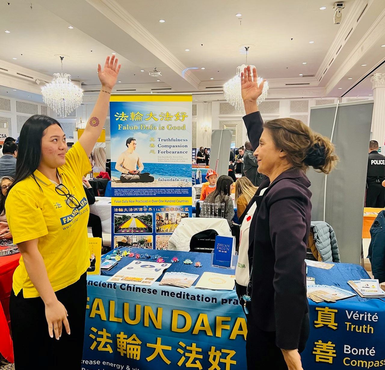 法轮大法的展位吸引了不少民众当场学功,约克社区的警察、民众及华人都表示支持法轮功学员反迫害。有的民众邀请法轮功学员去他们公司教功,有的家长认为,修炼法轮功会帮助他们的孩子成长为更好的人。