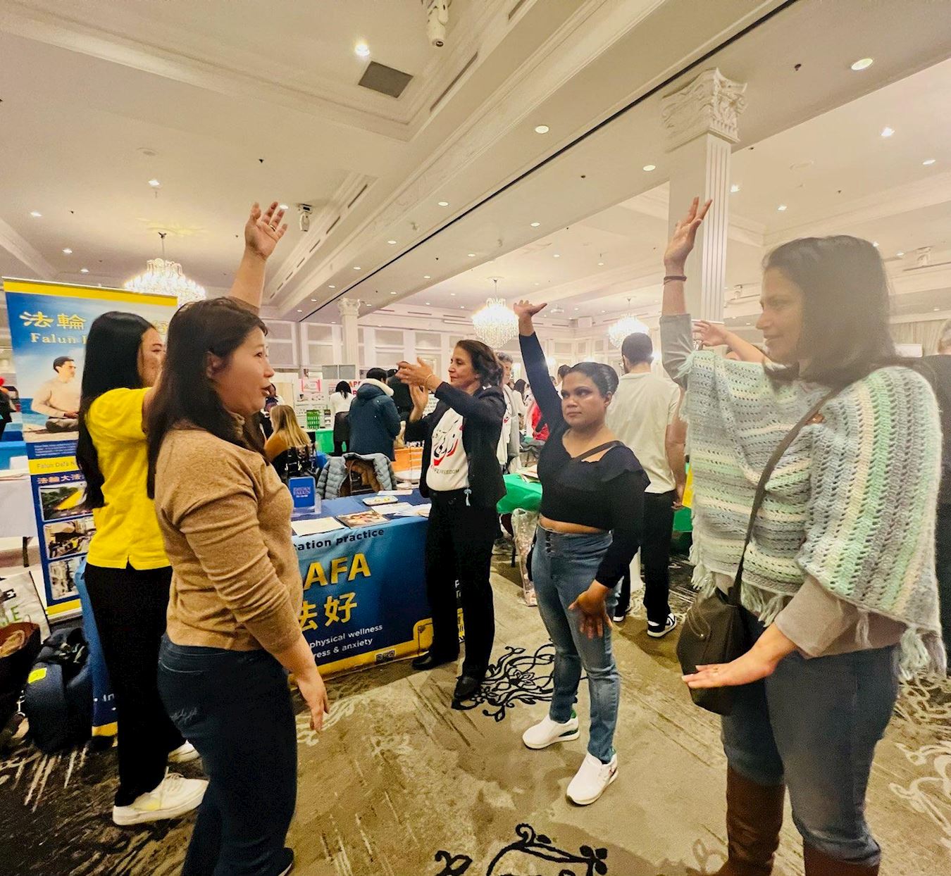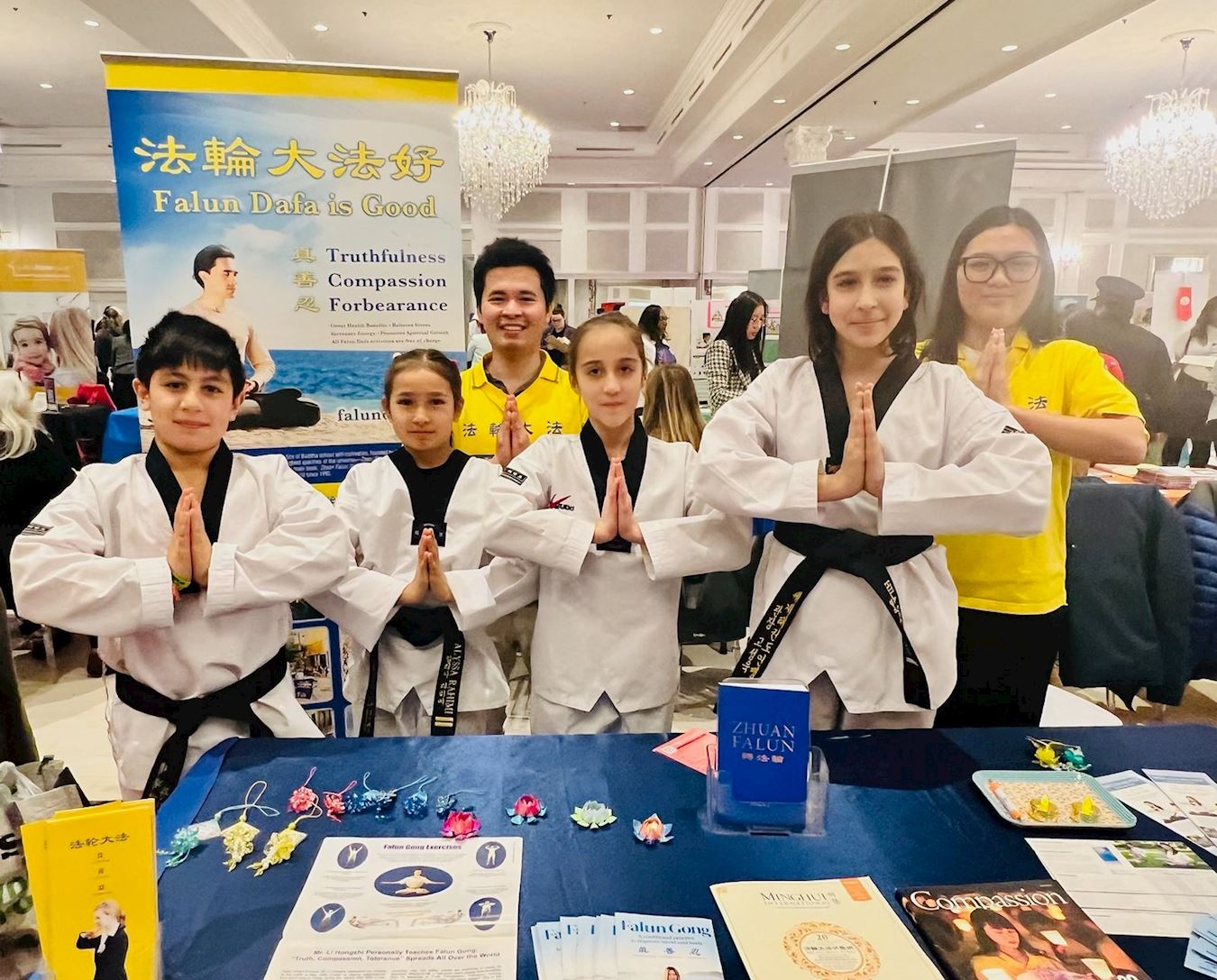 ![]() 图4:练习跆拳道的孩子们对打坐感兴趣,来到展位前了解法轮功。 |