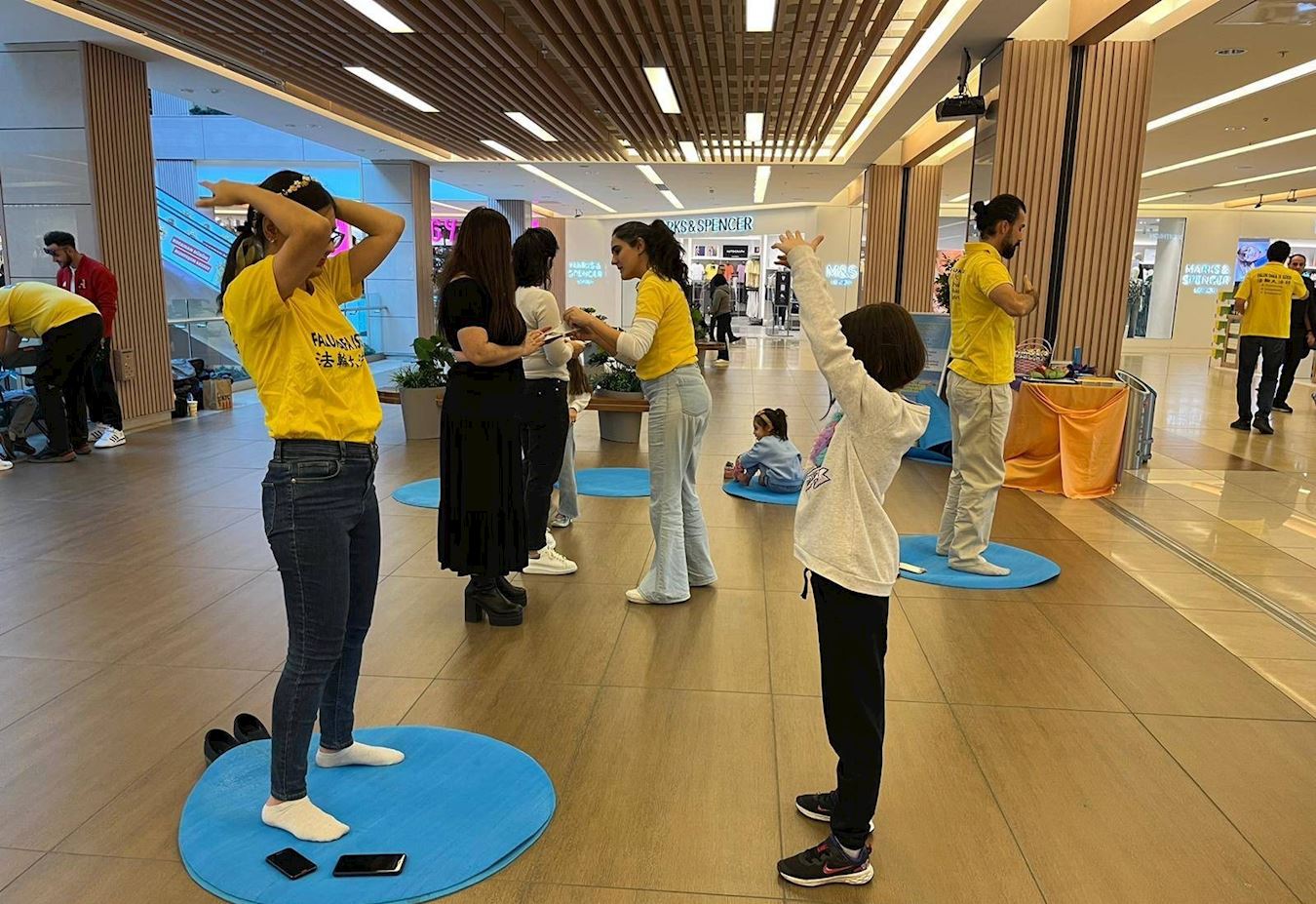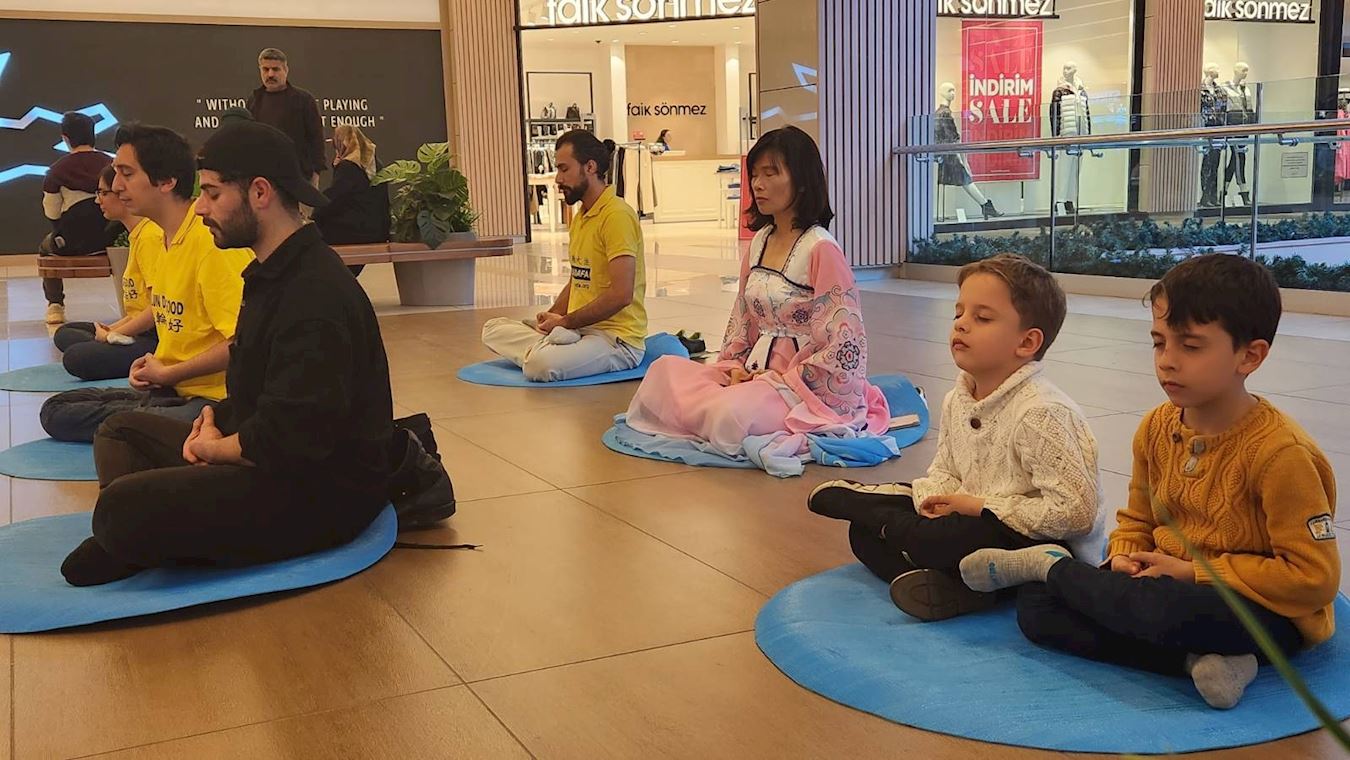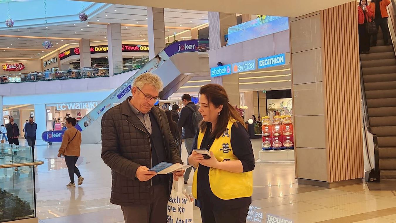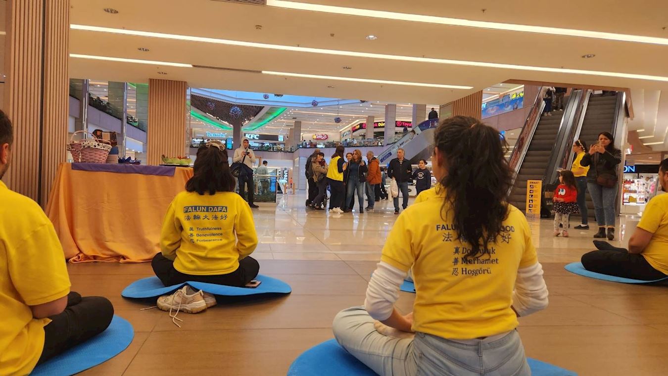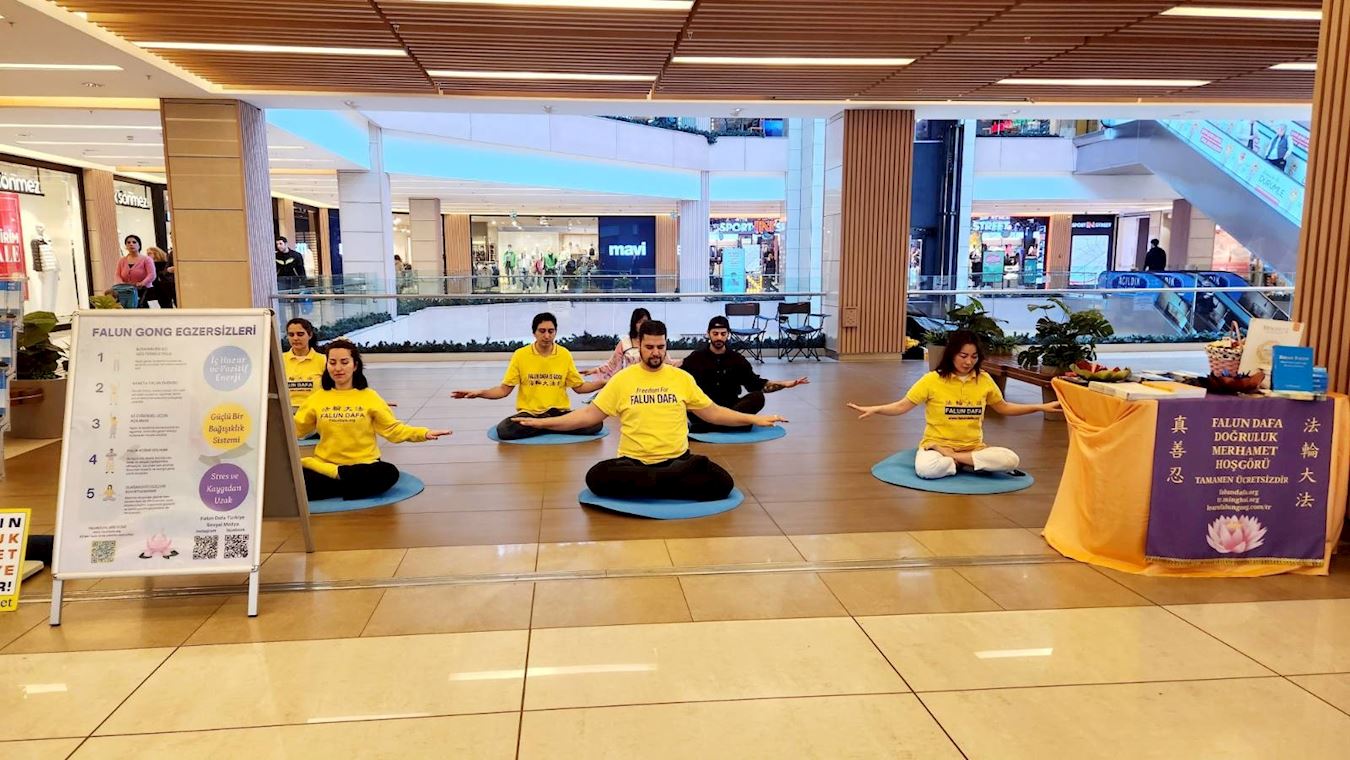 【明慧网二零二三年四月七日】二零二三年三月二十五日星期六,土耳其法轮功学员们在伊斯坦布尔亚洲区最受欢迎的购物中心之一Tepe Nautulis Avm,向人们介绍法轮功,并做功法演示。当法轮功学员们还在布置展位时,就已经有人急切地等待学习功法了。