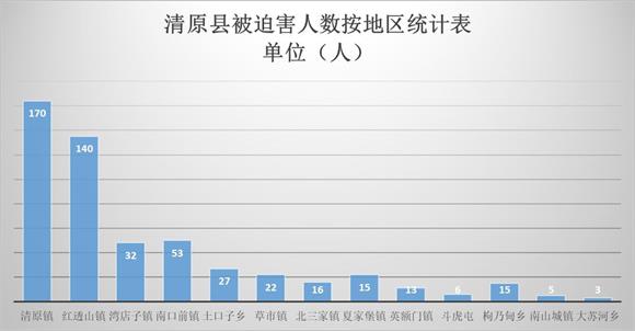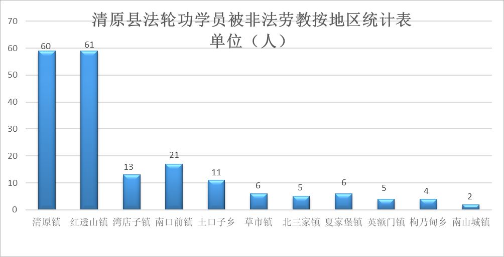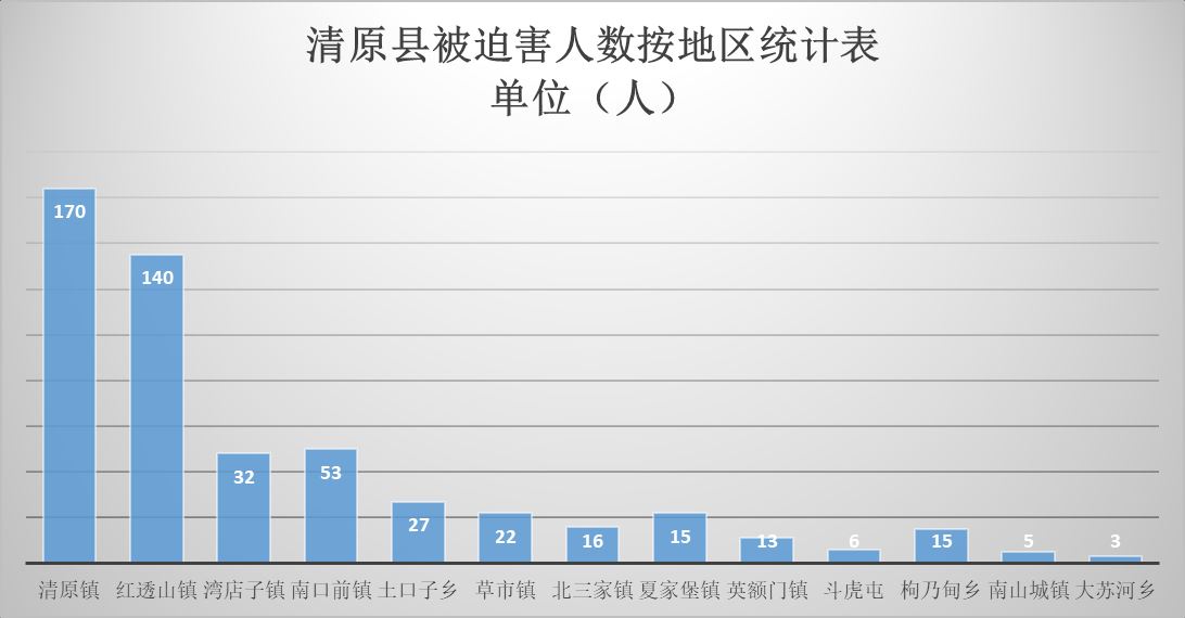 据不完全统计,一九九九年七月至二零二二年十二月,清原县十四个乡镇被迫害的法轮功学员有517人,经济迫害总额:2456591元。清原大法弟子被迫害致死(包括含冤离世)21人、被非法判刑61人、被非法劳教195人次、非法拘留238人次、被送罗台山庄洗脑班迫害的71人和其它办班的70人、被非法送精神病院迫害8人、被非法开除公职13人。大法弟子被绑架过的,几乎都被经济勒索过,由于篇幅有限,在此不详细叙述,详见辅助材料
