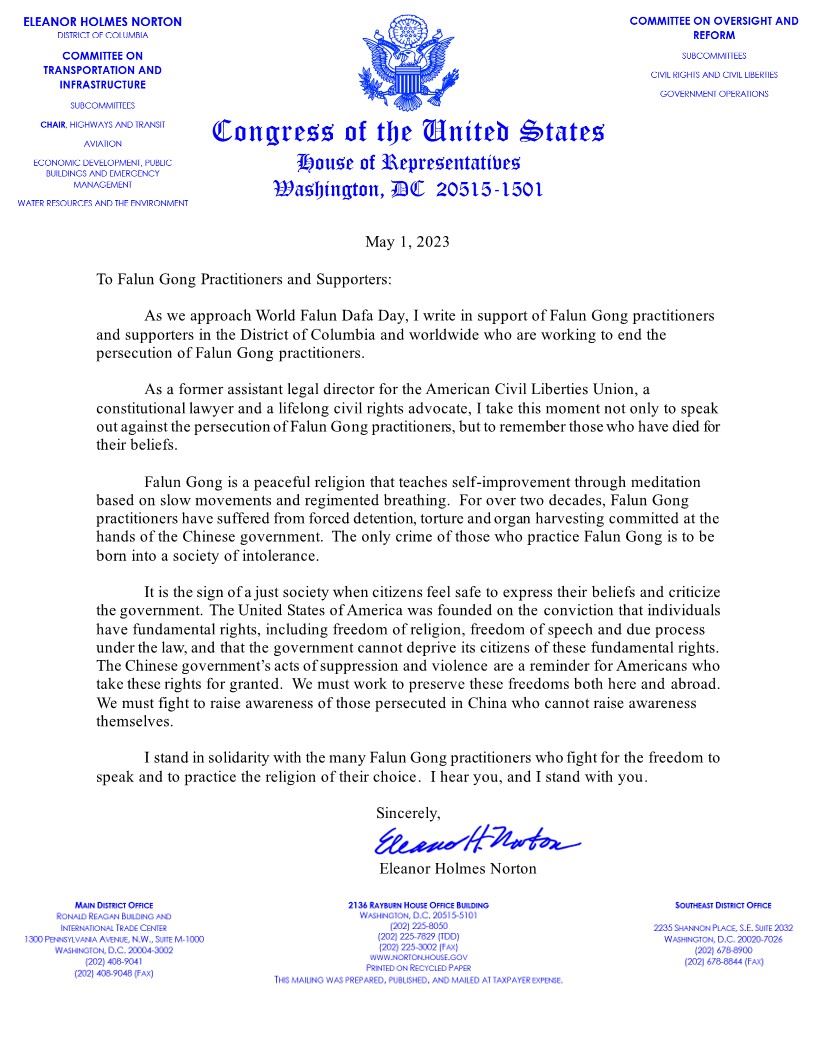 ![]() 图1:美国首都华盛顿哥伦比亚特区联邦众议员埃莉诺·霍姆斯·诺顿(Eleanor Holmes Norton)致信声援法轮功学员。 |