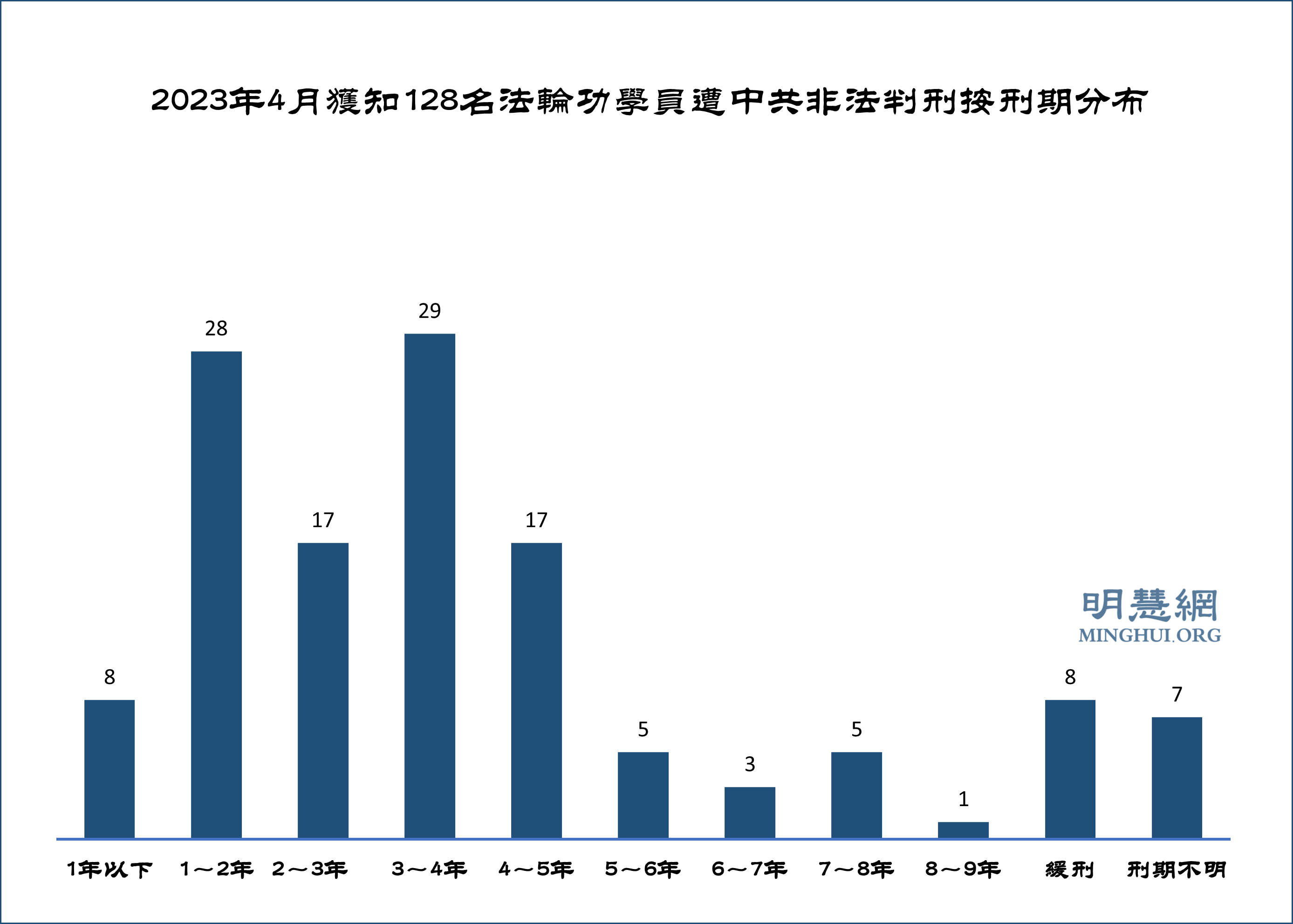 ![]() 图1:2023年4月获知128名法轮功学员遭中共非法判刑按刑期分布 |