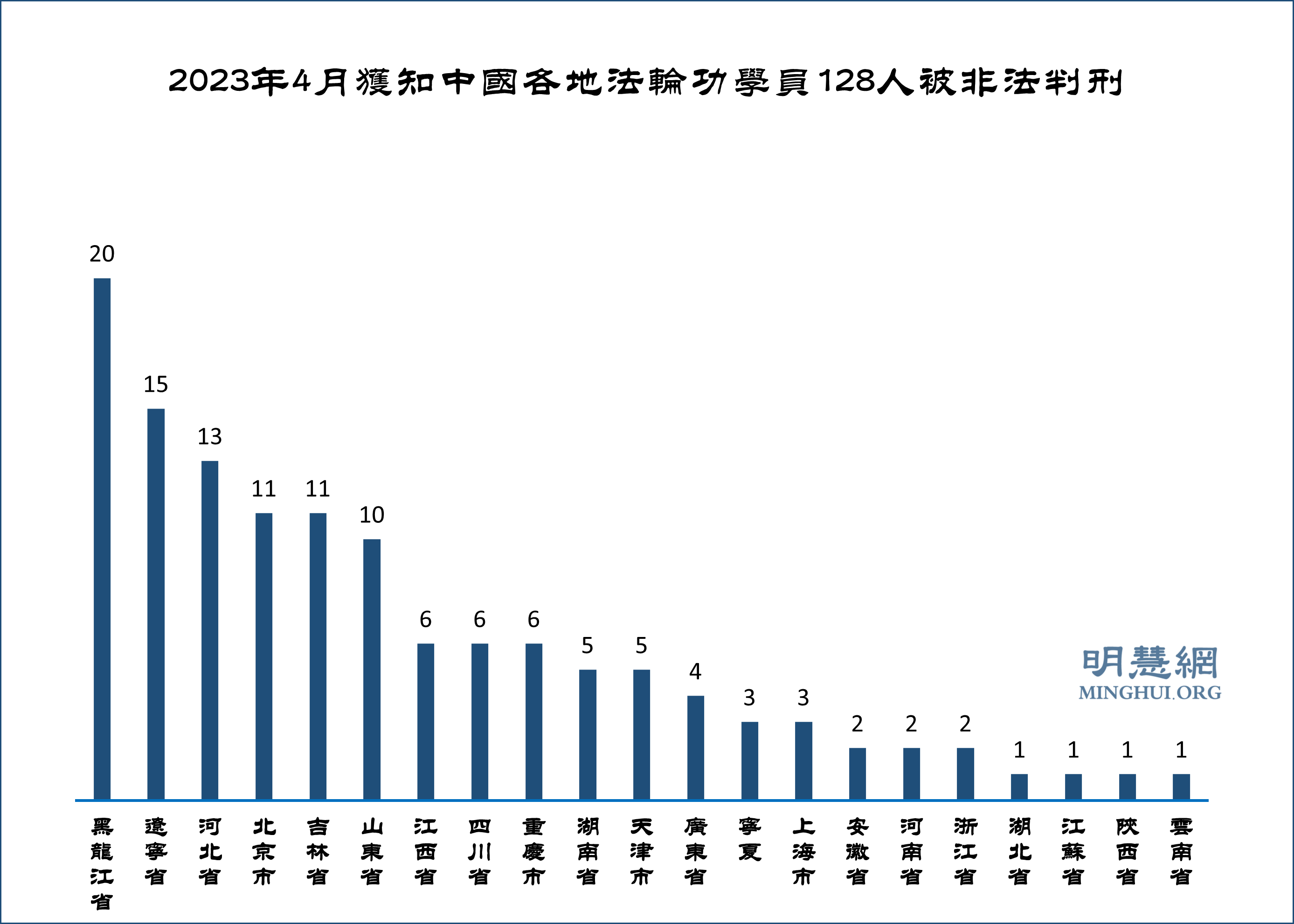 ![]() 图2:2023年4月获知中国各地法轮功学员128人被非法判刑 |