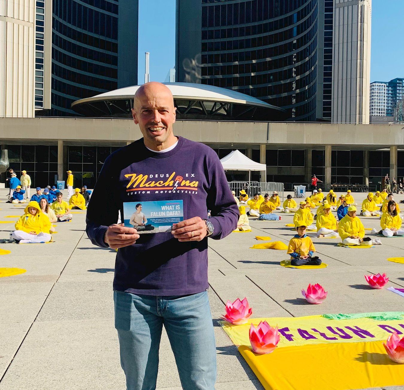迈克尔(Michael)来自欧洲荷兰,是一名飞行员,工作原因来到了多伦多。他说他年轻时是练空手道的。“在训练前后,我们都会打坐。一开始,我觉得奇怪。再后来,我真的感觉到轻松了。所以我觉得身体和心灵的平衡很重要,打坐会帮人达到这种平衡,有益于健康。”