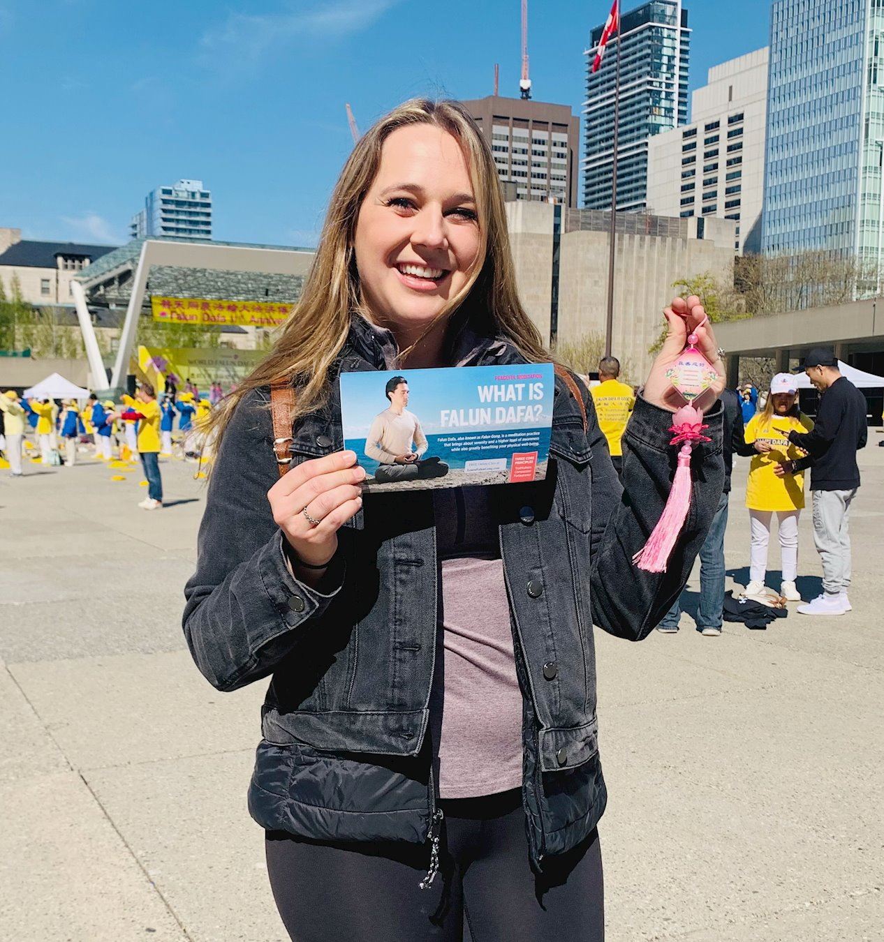 麦肯锡(Mckenzie)来自美国,从事市场运营工作。“看到这么多人在广场上安静的炼功,动作整齐,真的很壮观,这吸引了我和我的家人过来。我也想要学炼法轮功,我知道炼功打坐能带来很多好处,比如帮助人放松环境的压力,以及让大脑更能集中精力。我回去也会去访问法轮大法的网站做更多了解并学习。”