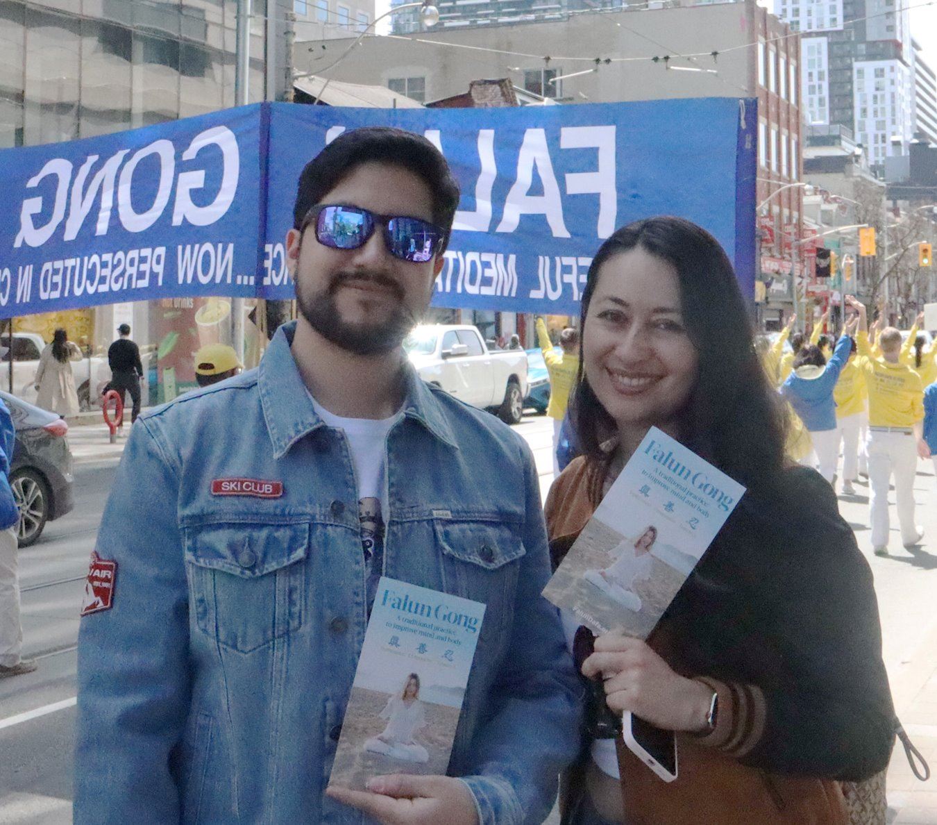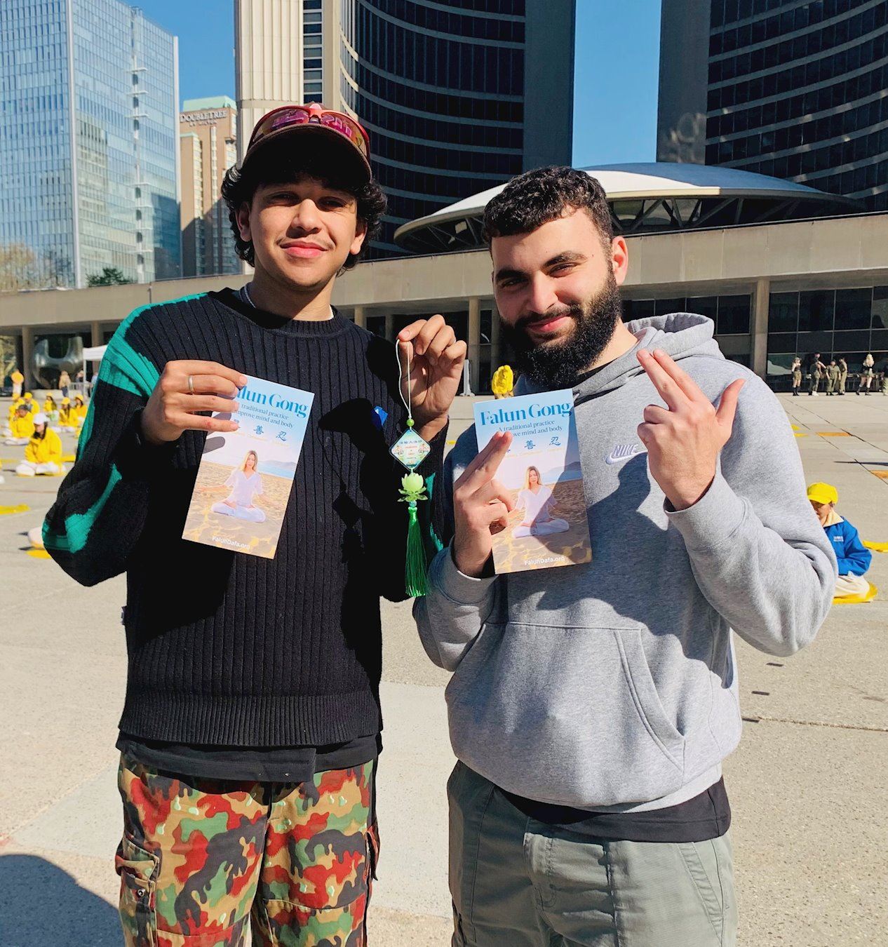 阿米内(Amine)和伊西恩(Icine)来自法国巴黎,他们是在加拿大蒙特利尔工作的工程师。“我这是第一次了解什么是修炼。因为看到很多人在广场上炼功,而且功法看起来很好,让我们感到祥和,他们的表情都很平静、舒服,所以过来了解这个功法。回去会去访问法轮功的网站,我也想学炼这个功法。”阿米内说。