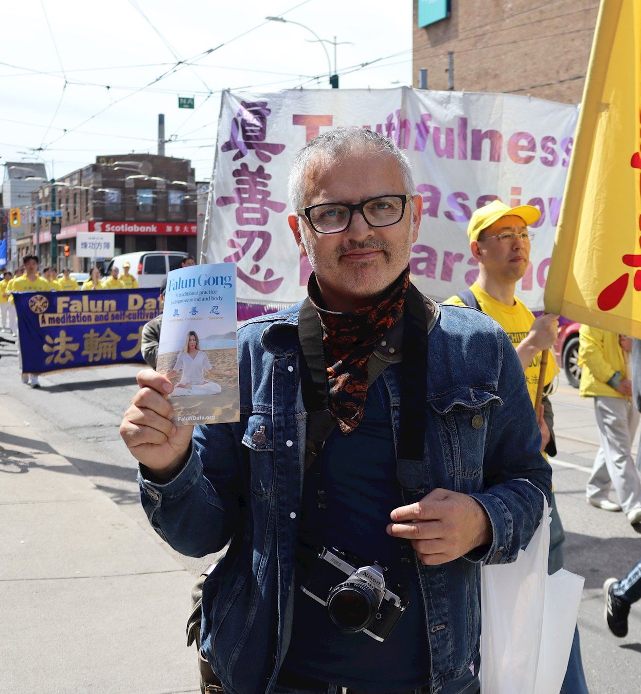 来自土耳其的视频制作人图尔古特(Turgut)先生用自己的胶卷相机为游行队伍进行拍照,他说:“我非常喜欢他们的服装,很靓丽。我用相机拍了很多照片,我会把照片发到我的社交媒体平台,让更多的人知道法轮大法。”
