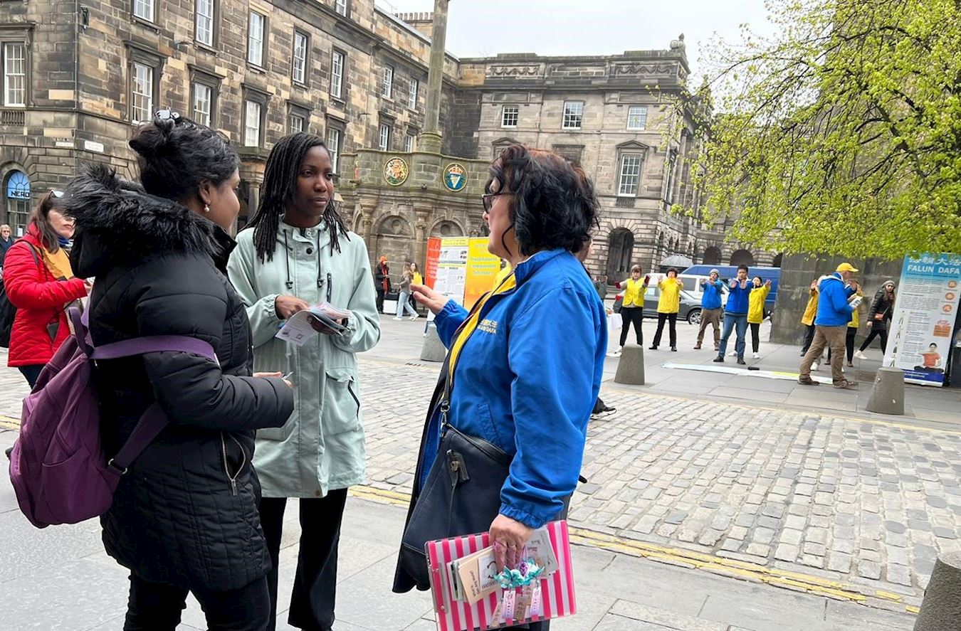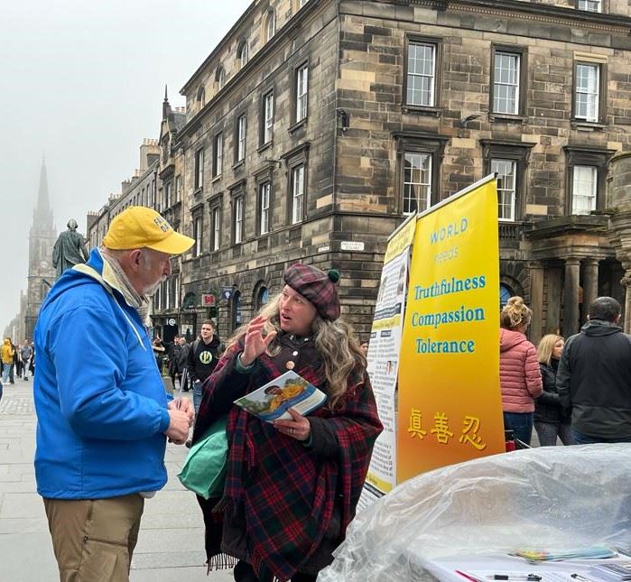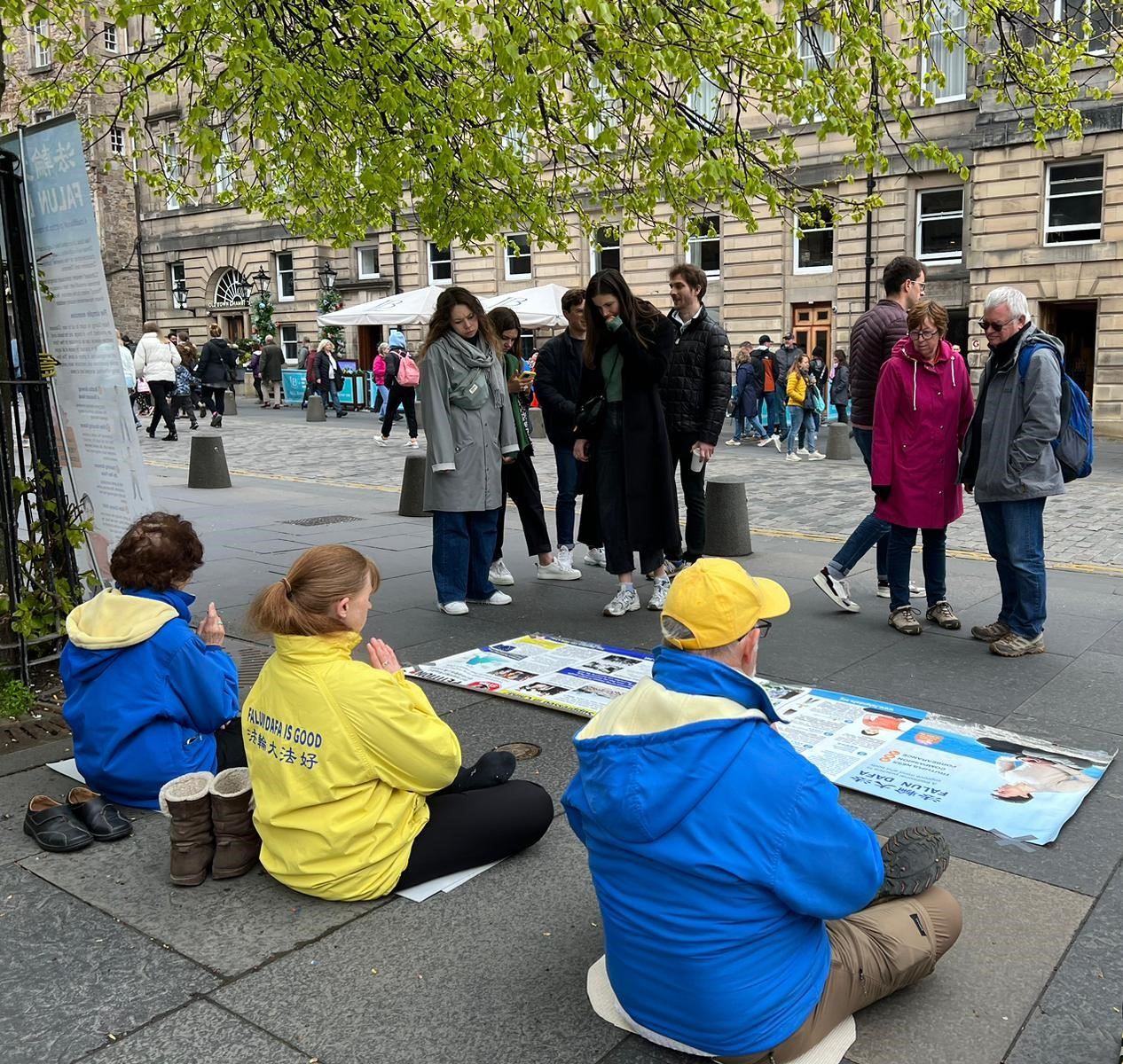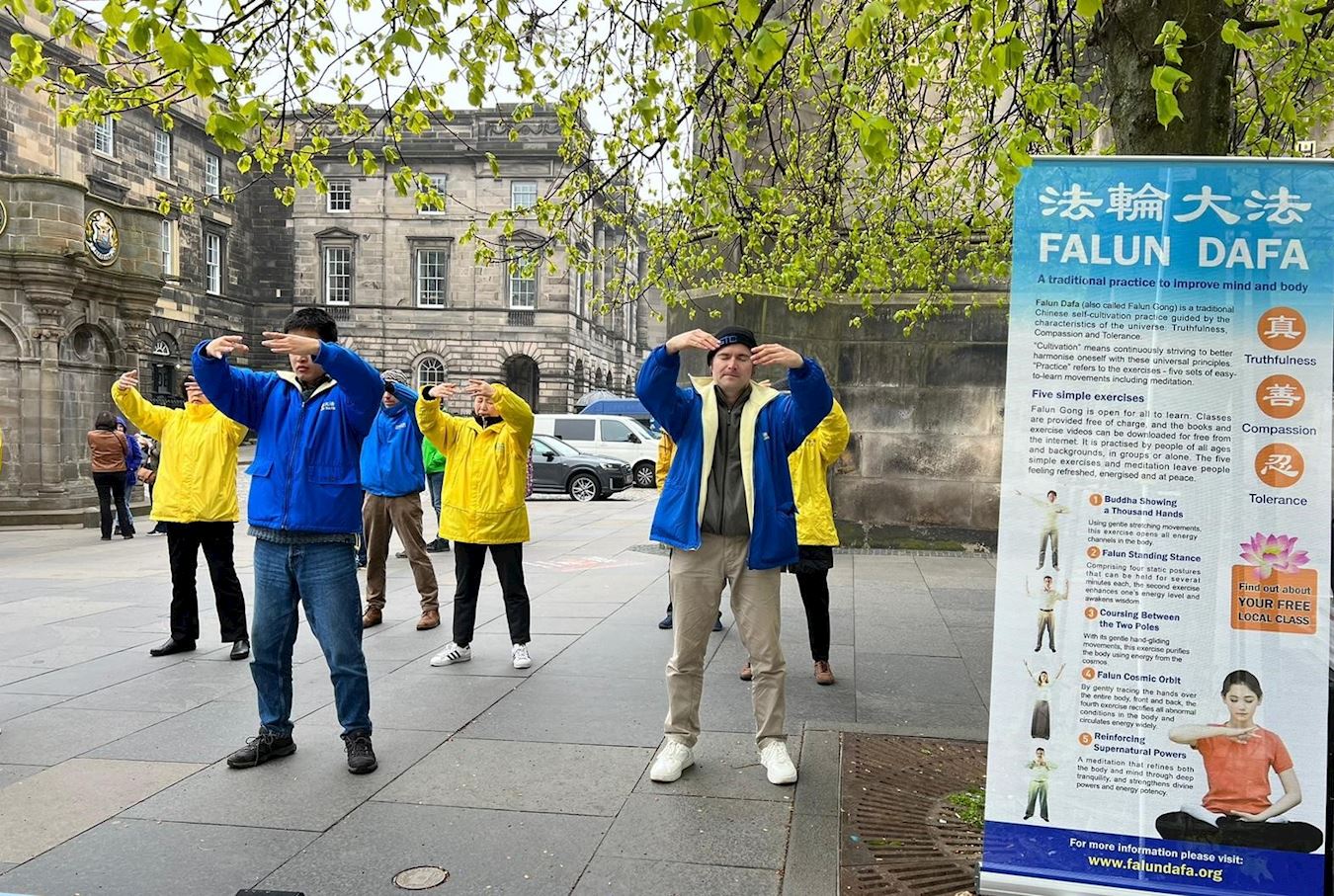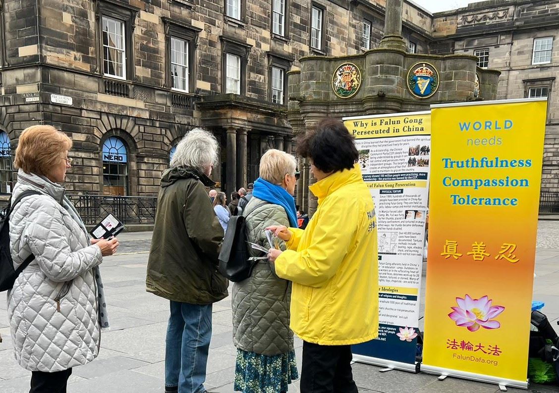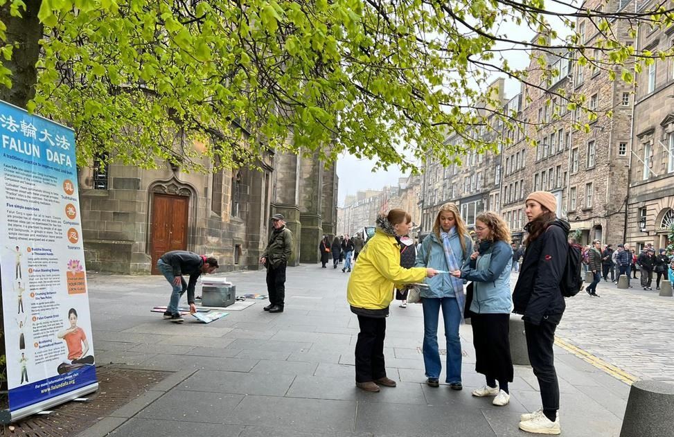 皇家一英里(Royal Mile),是爱丁堡老城最繁忙的旅游街道,每年有上千万游客到访,旧市政厅也位于此。学员的弘法点与旧市政厅隔街相望,是游客的必经之地。中英文的“法轮大法好”横幅、法轮大法五套功法简介、以及“为什么中共迫害大法修炼者”的展板直立在古老的街道上,祥和优美的功法吸引了游人驻足观看。
