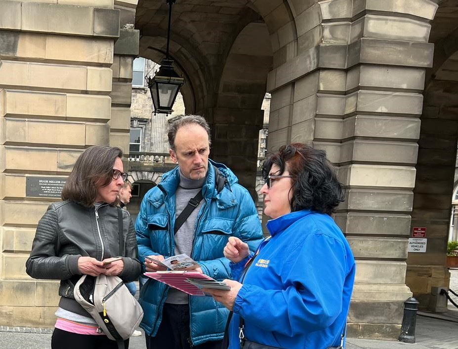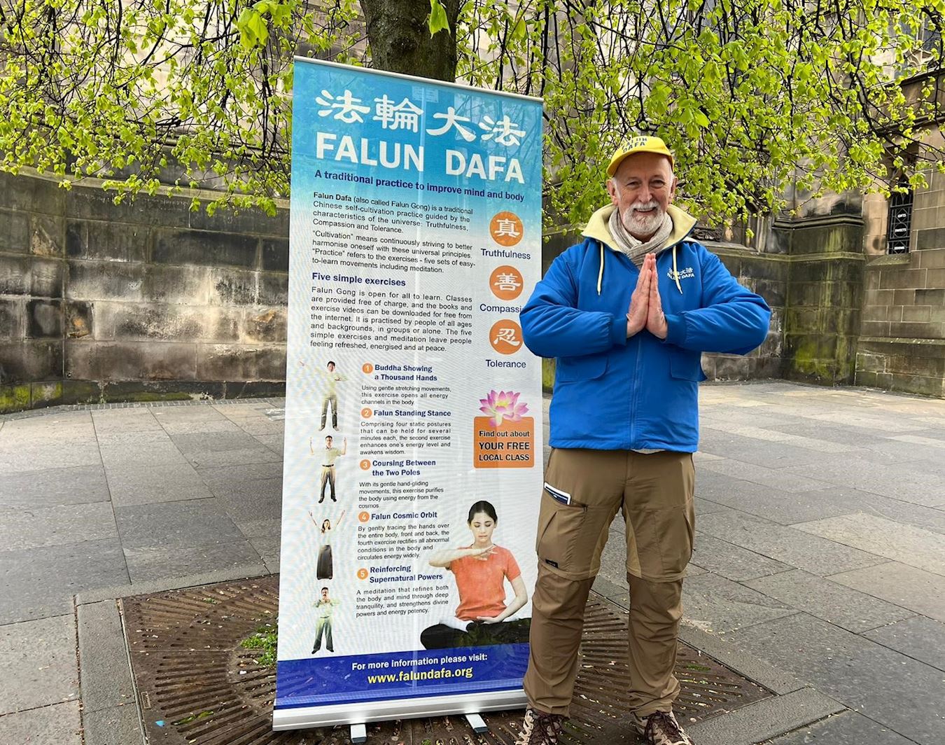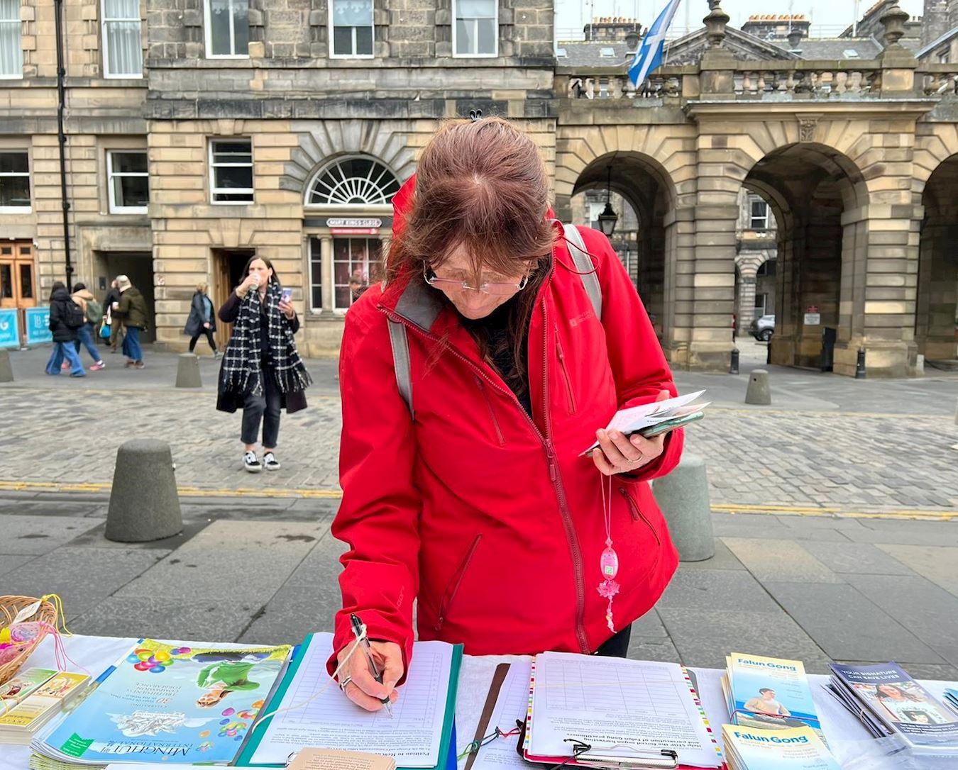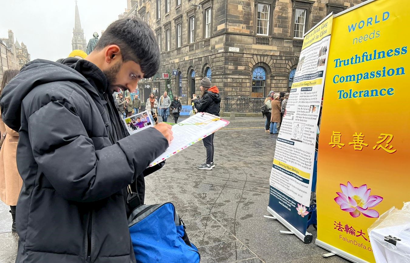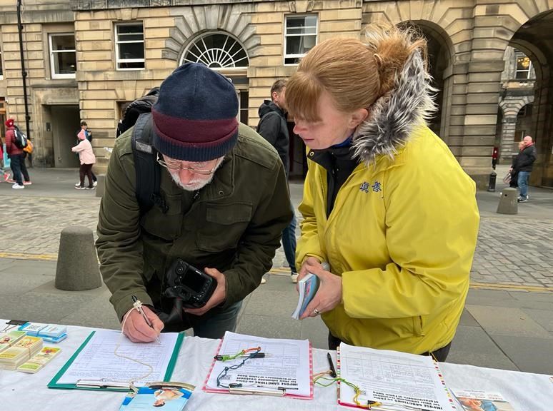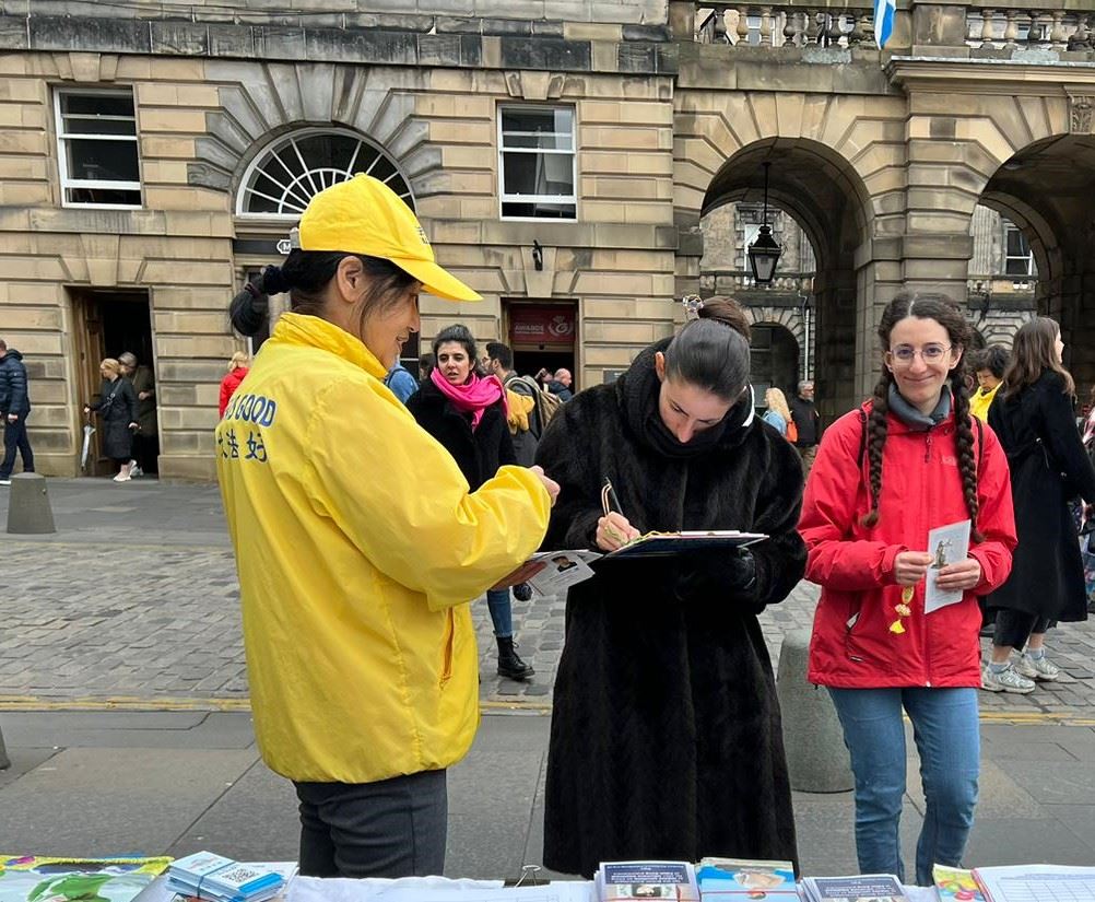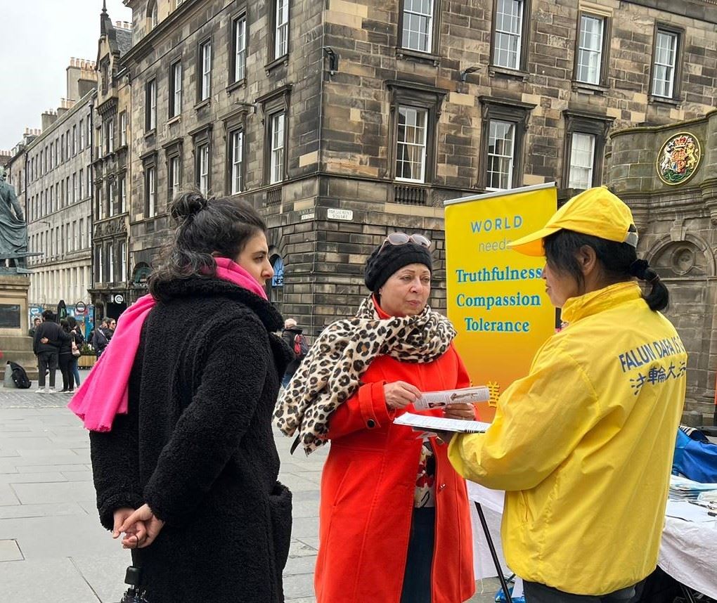 皇家一英里(Royal Mile),是爱丁堡老城最繁忙的旅游街道,每年有上千万游客到访,旧市政厅也位于此。学员的弘法点与旧市政厅隔街相望,是游客的必经之地。中英文的“法轮大法好”横幅、法轮大法五套功法简介、以及“为什么中共迫害大法修炼者”的展板直立在古老的街道上,祥和优美的功法吸引了游人驻足观看。