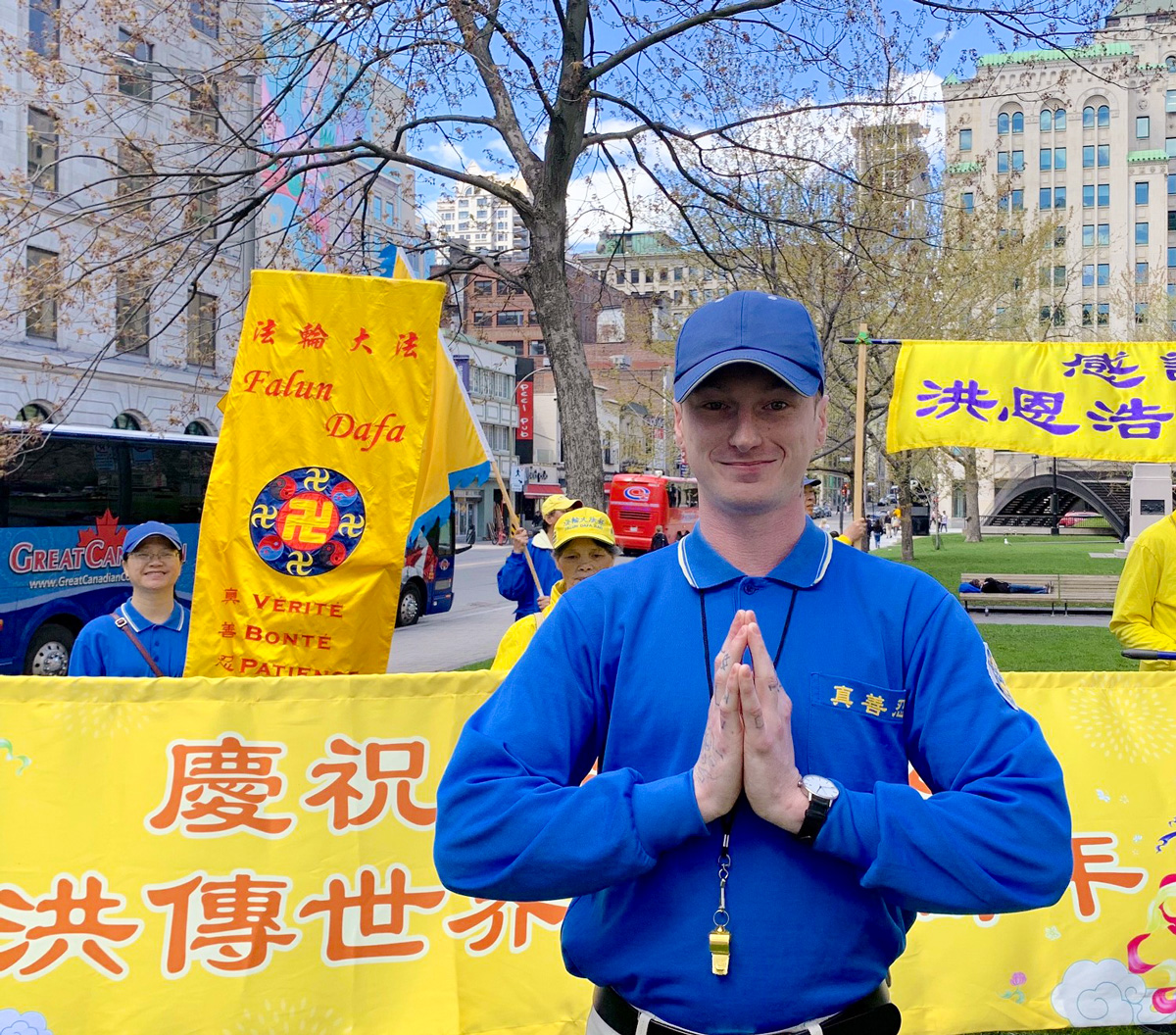 现在他担任蒙特利尔天国乐团的指挥,到各地参加游行,让更多魁北克人知道法轮大法的美好。他对师父无比感谢:“没有语言足以表达我的感恩,只能化为一句话:谢谢师父慈悲救度!恭祝师尊生日快乐!”