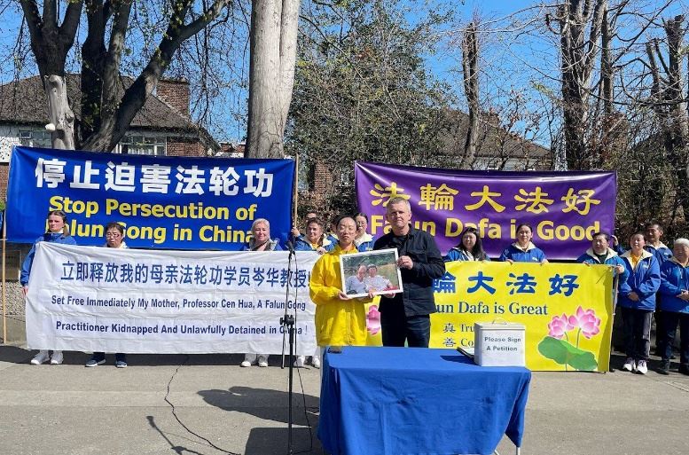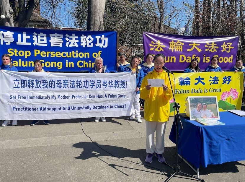 李松原在新闻发布会上说:“四月十四日,我的母亲岑华教授遭到中国警方绑架。她在中国正被非法拘留,这一切仅仅因为她是一名法轮功修炼者。”
