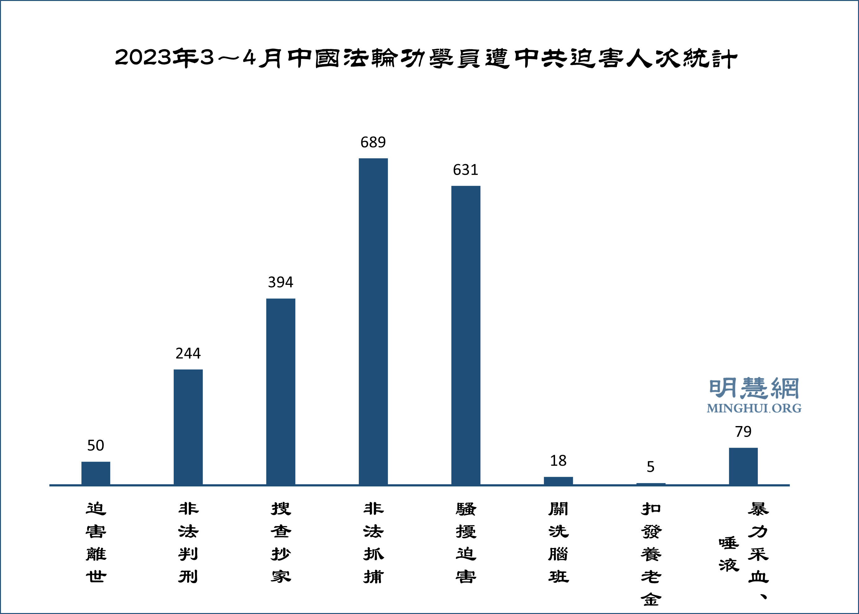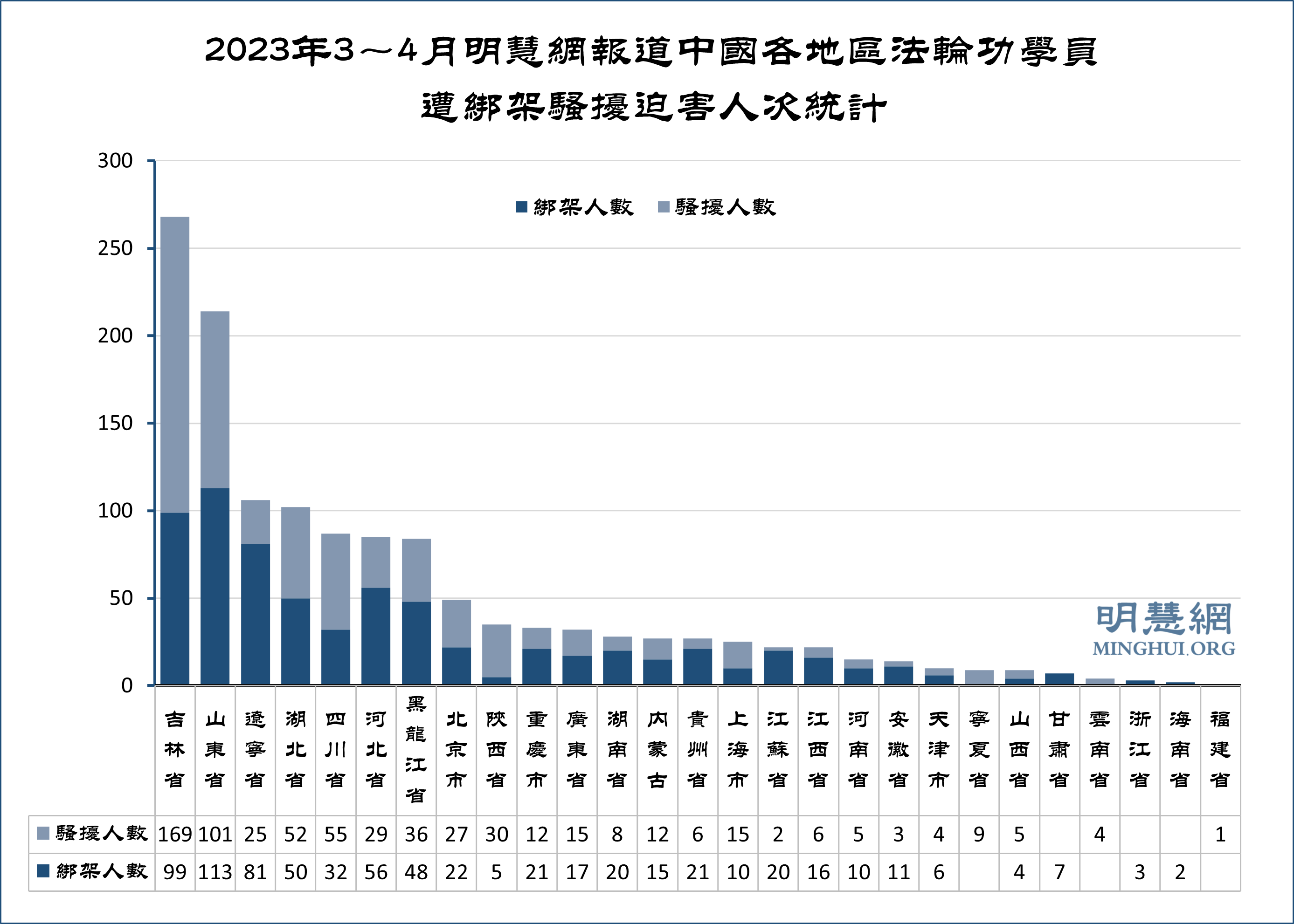 ![]() 图1:2023年3~4月中国法轮功学员遭中共迫害人次统计 |
