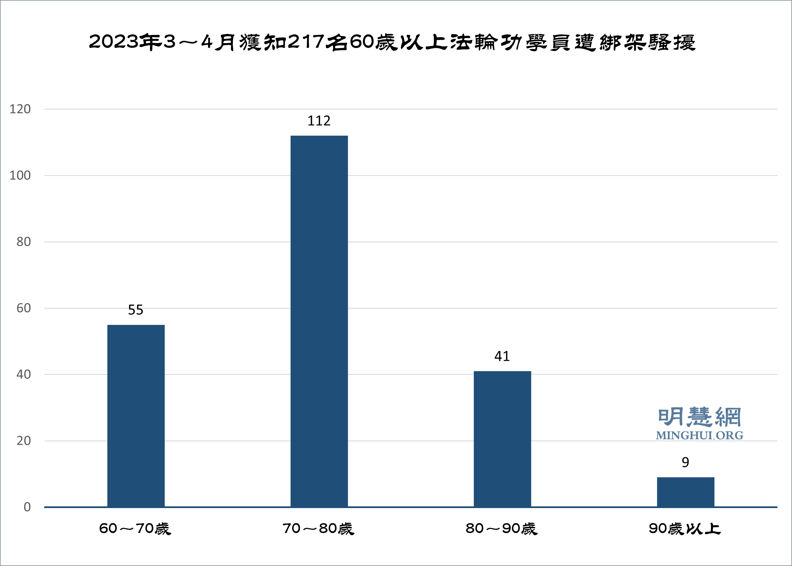 据明慧网报道统计,二零二三年三至四月份获知217名60岁以上老年法轮功学员被绑架骚扰。其中,被绑架143人,被骚扰74人。90岁以上9人,80~90岁41人,70~80岁112人,60~70岁55人。