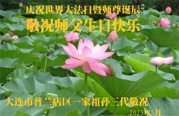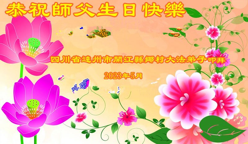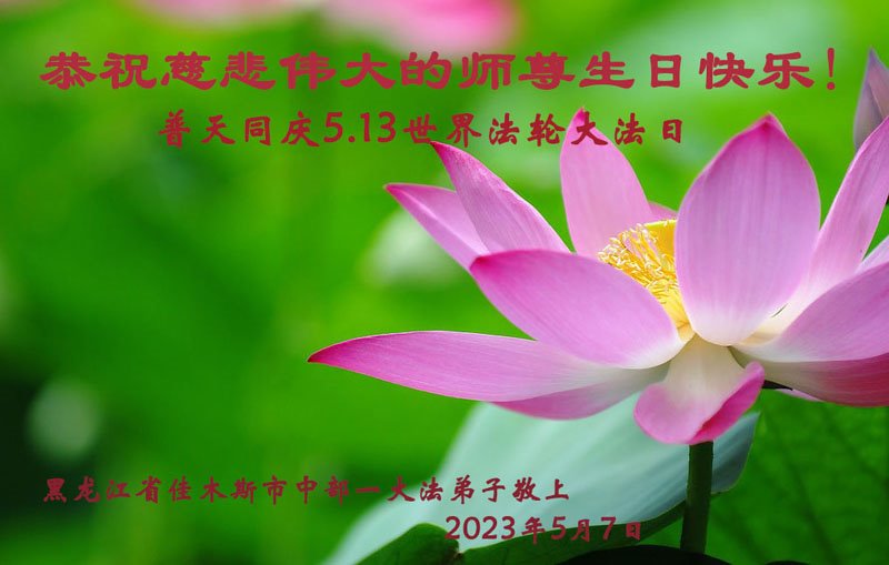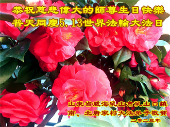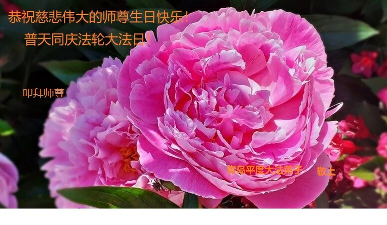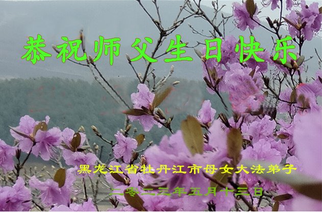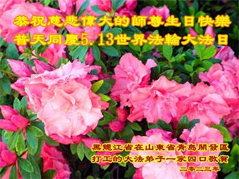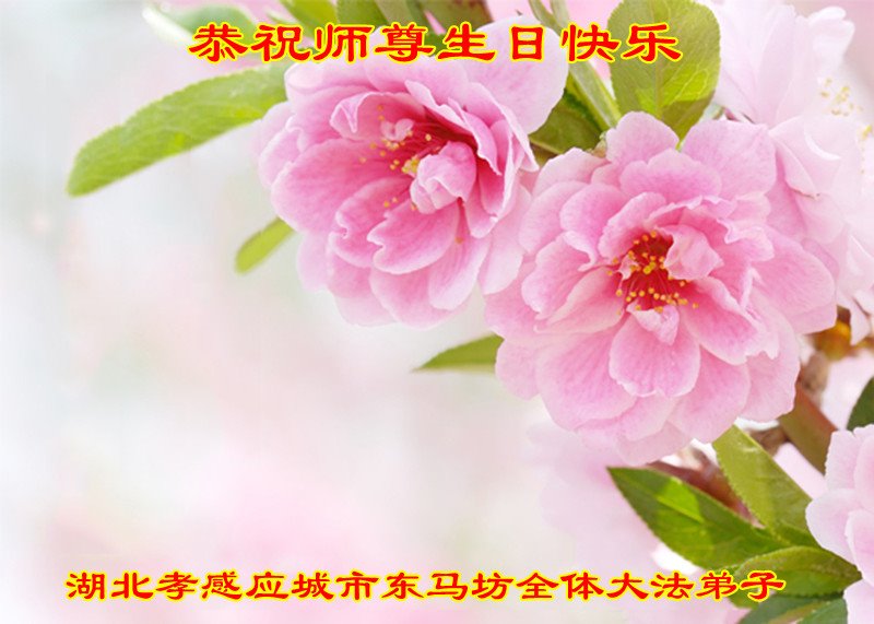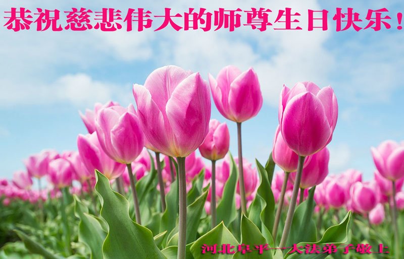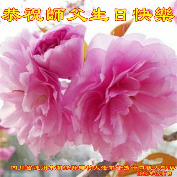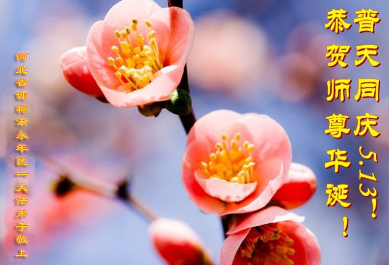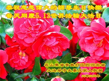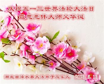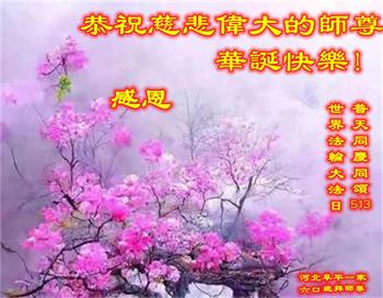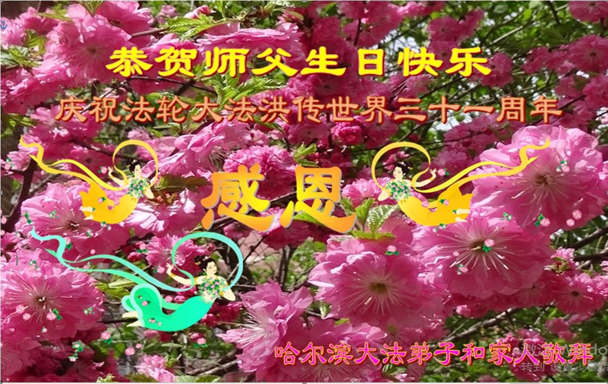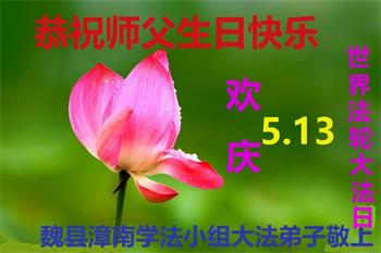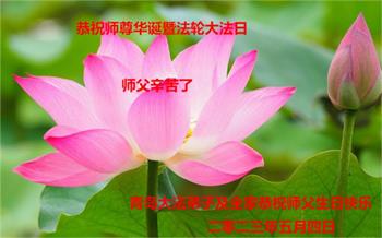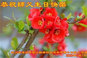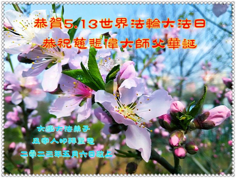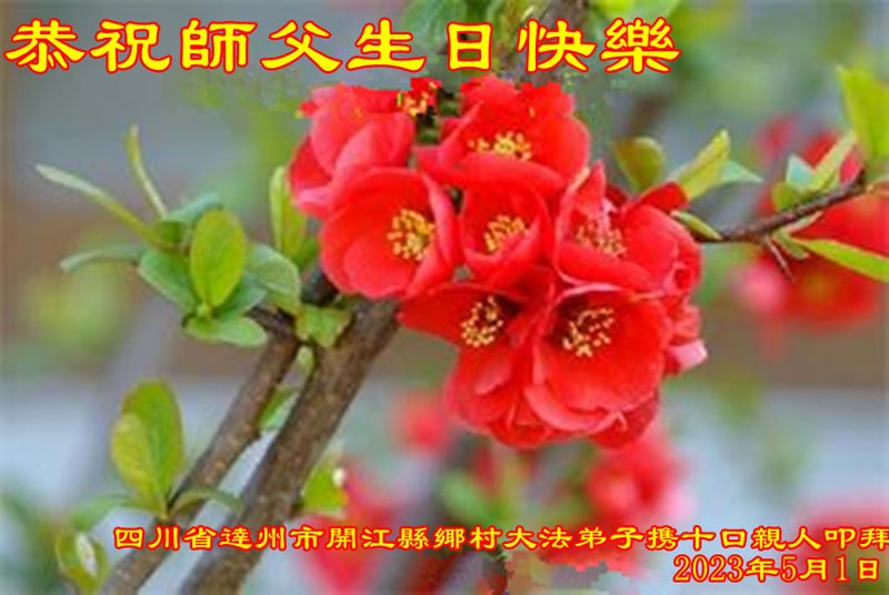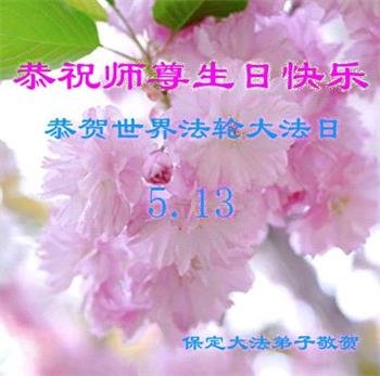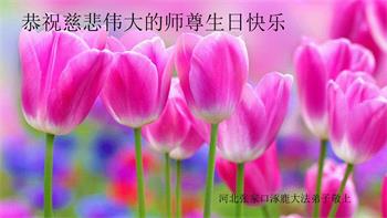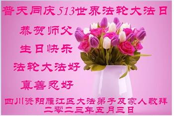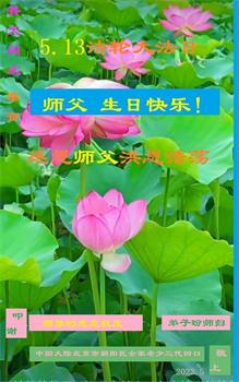 尊敬的李大师好!我是大法弟子的家人。明媚的五月,春风送暖,百花盛开,姹紫嫣红,春意盎然,喜逢大师华诞,诚心恭贺李大师生日快乐!大师新年发表的《为什么会有人类》的文章,我拜读了,并且听了好多遍。这是大师赐予人类的宝物,深感大师佛恩浩荡!感谢大师的慈悲救度!我也要做一个正直、善良、知感恩的好人。我天天诚心敬念”法轮大法好、真善忍好”九字真言。有大师的护佑,我们都是幸运的,个个幸福安康。
