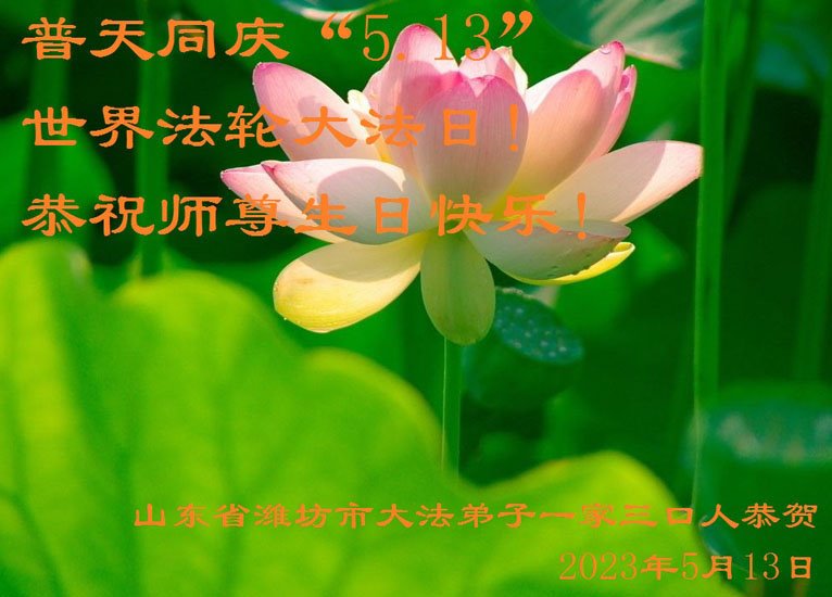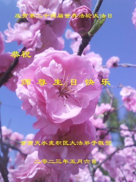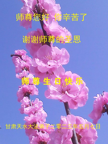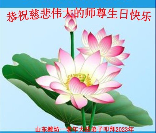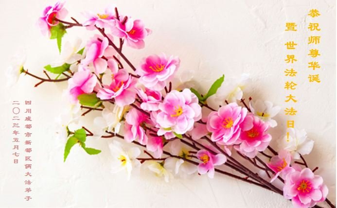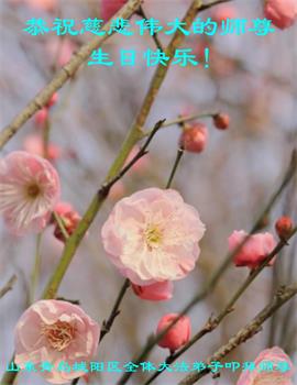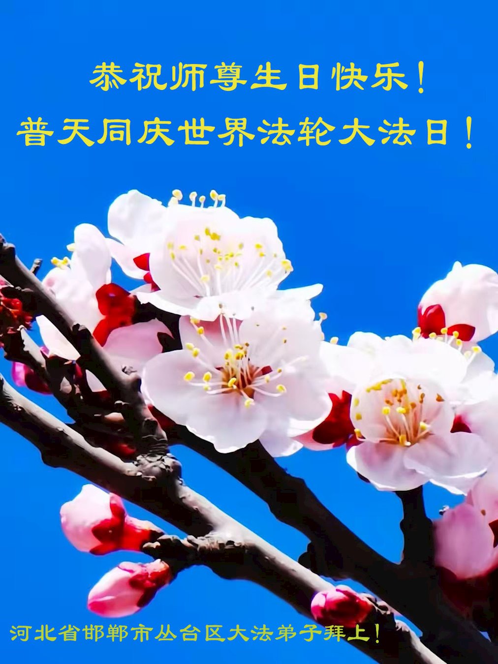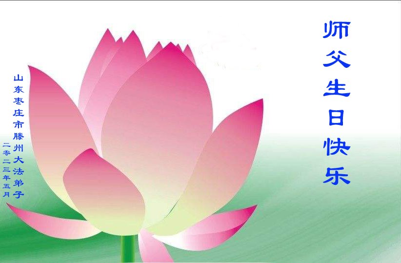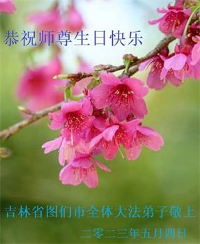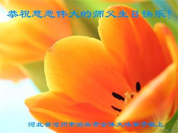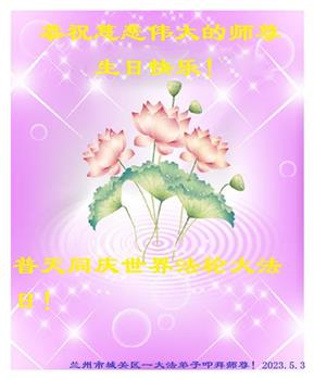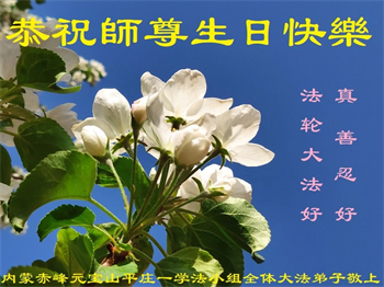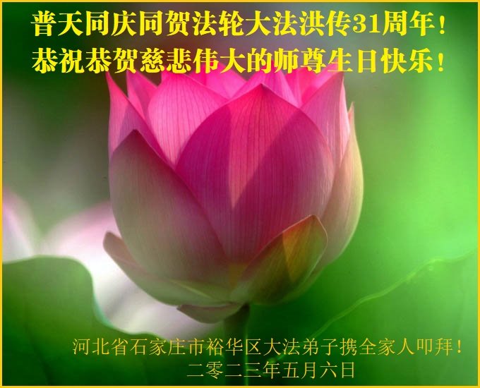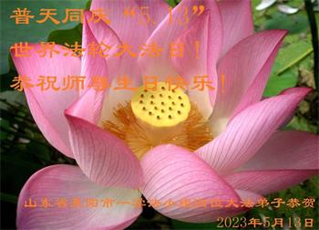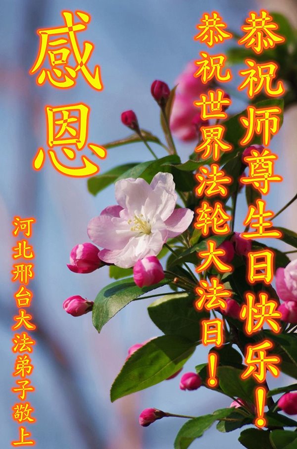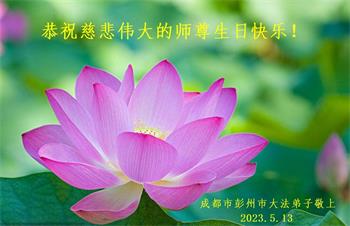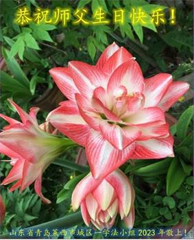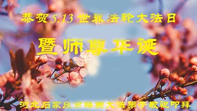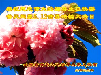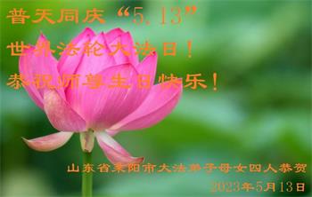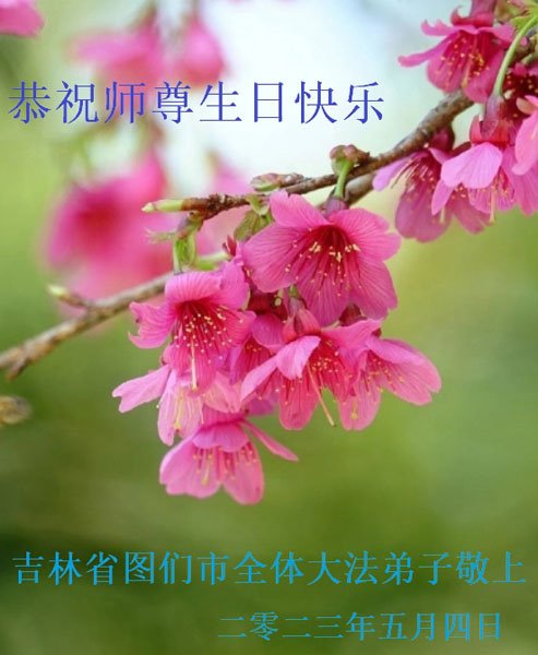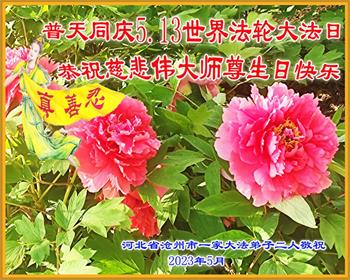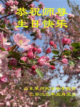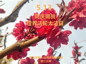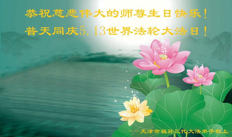 尊敬的李大师好!我是大法弟子的家人。明媚的五月,春风送暖,百花盛开,姹紫嫣红,春意盎然,喜逢大师华诞,诚心恭贺李大师生日快乐!大师新年发表的《为什么会有人类》的文章,我拜读了,并且听了好多遍。这是大师赐予人类的宝物,深感大师佛恩浩荡!感谢大师的慈悲救度!我也要做一个正直、善良、知感恩的好人。我天天诚心敬念”法轮大法好、真善忍好”九字真言。有大师的护佑,我们都是幸运的,个个幸福安康。