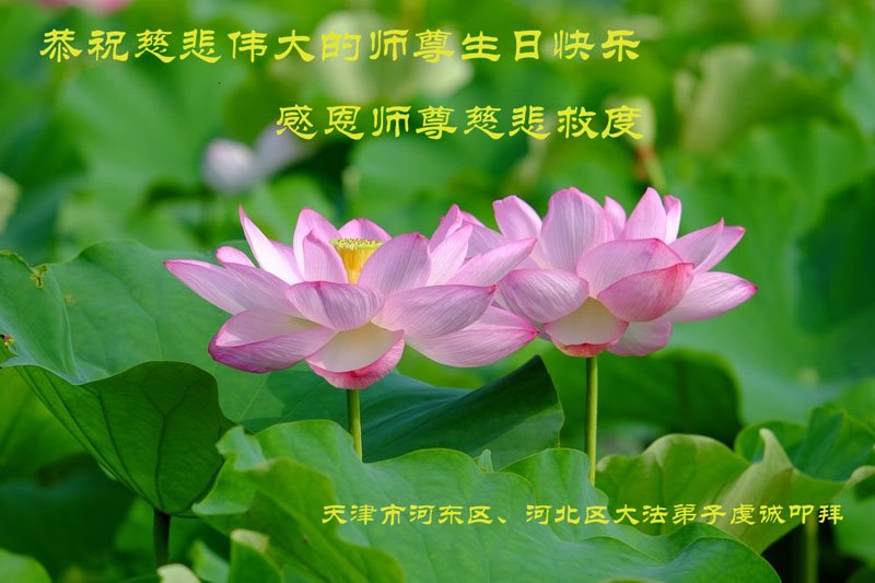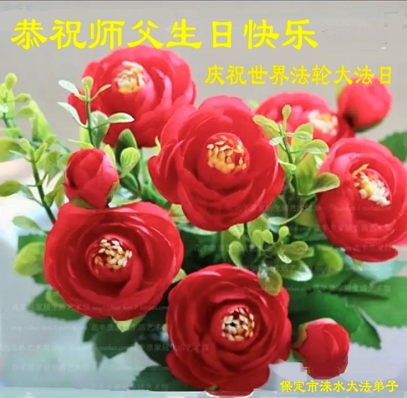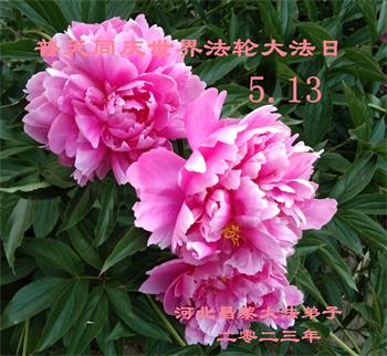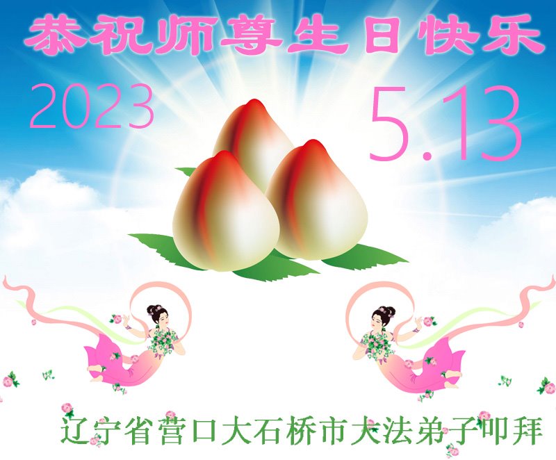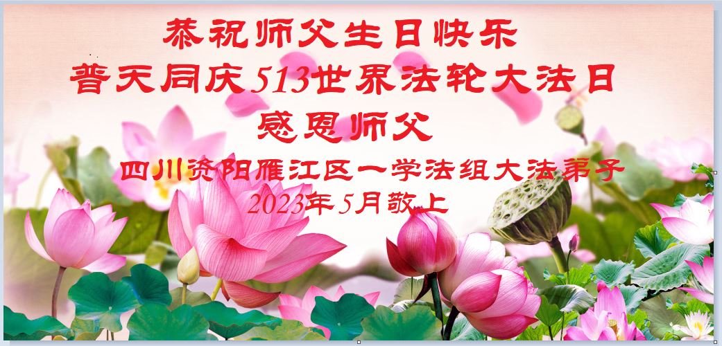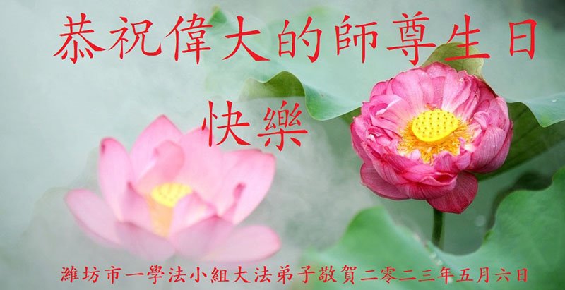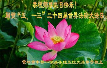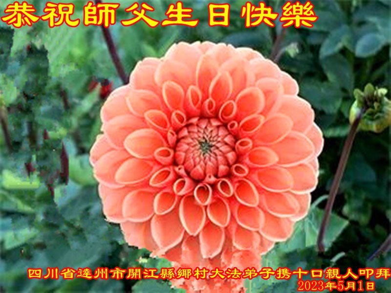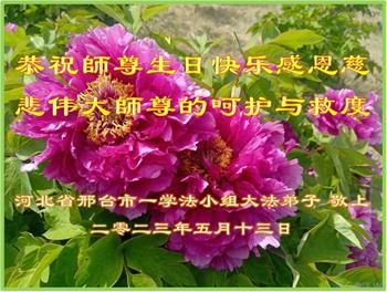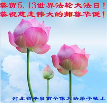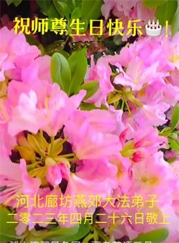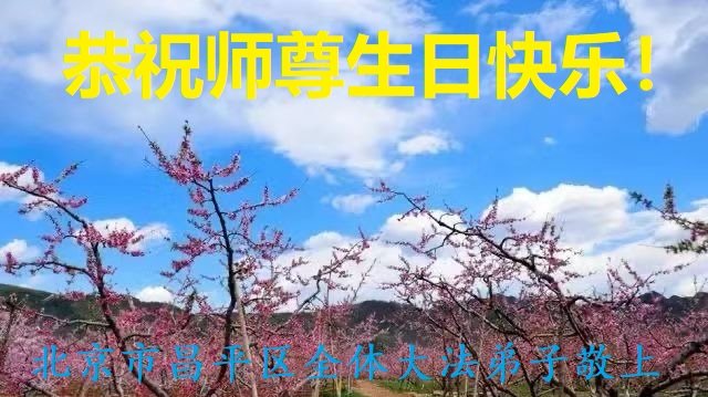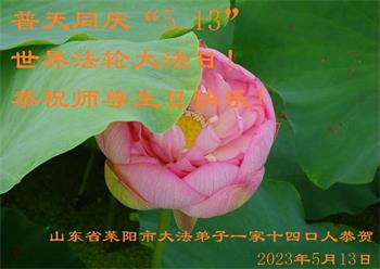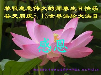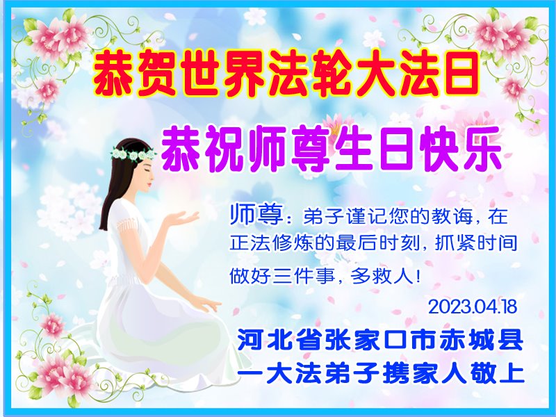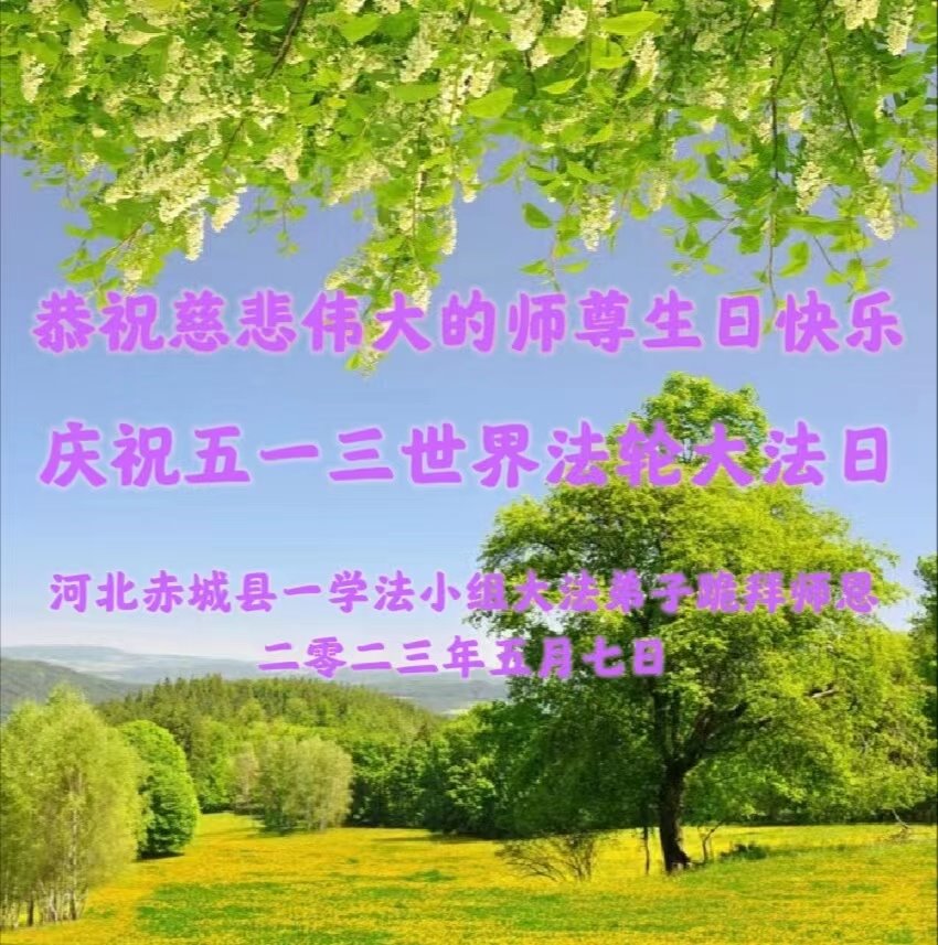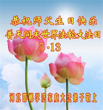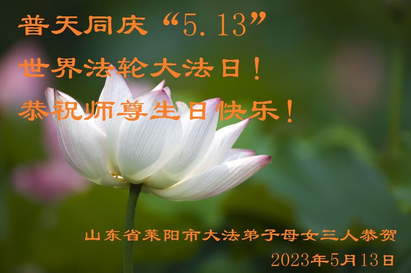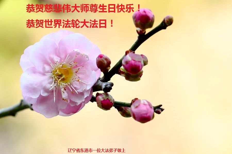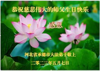 尊敬的李大师好!我是大法弟子的家人。明媚的五月,春风送暖,百花盛开,姹紫嫣红,春意盎然,喜逢大师华诞,诚心恭贺李大师生日快乐!大师新年发表的《为什么会有人类》的文章,我拜读了,并且听了好多遍。这是大师赐予人类的宝物,深感大师佛恩浩荡!感谢大师的慈悲救度!我也要做一个正直、善良、知感恩的好人。我天天诚心敬念”法轮大法好、真善忍好”九字真言。有大师的护佑,我们都是幸运的,个个幸福安康。