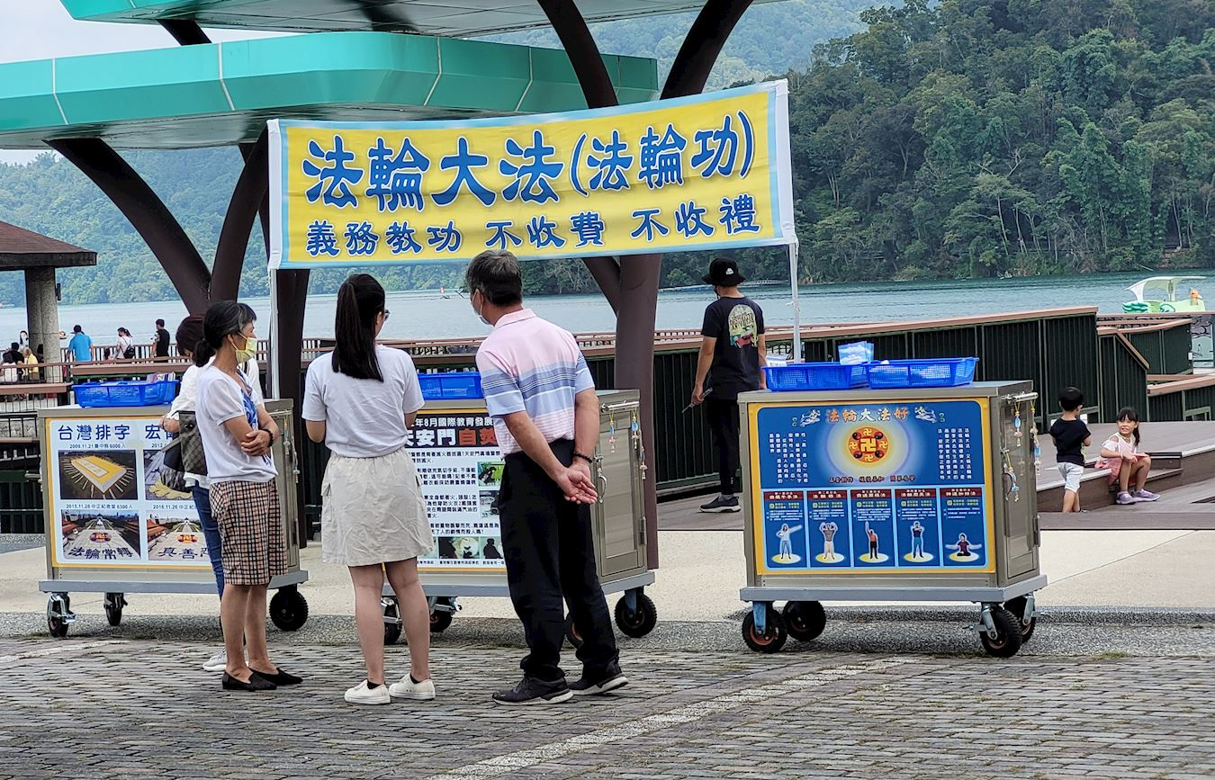 秋月分享十几年来到日月潭讲真相的一些神奇体验,她说,“每星期二都与几位学员固定到日月潭讲真相,无论逢年过节、天气如何刮风下雨,甚至气象报导台风将来台湾(最后台风都转向到其他地方去了),这些都无法动摇我们前去讲真相的心,很特别的是,我们几乎很少遇到下雨被雨淋湿的情况。”