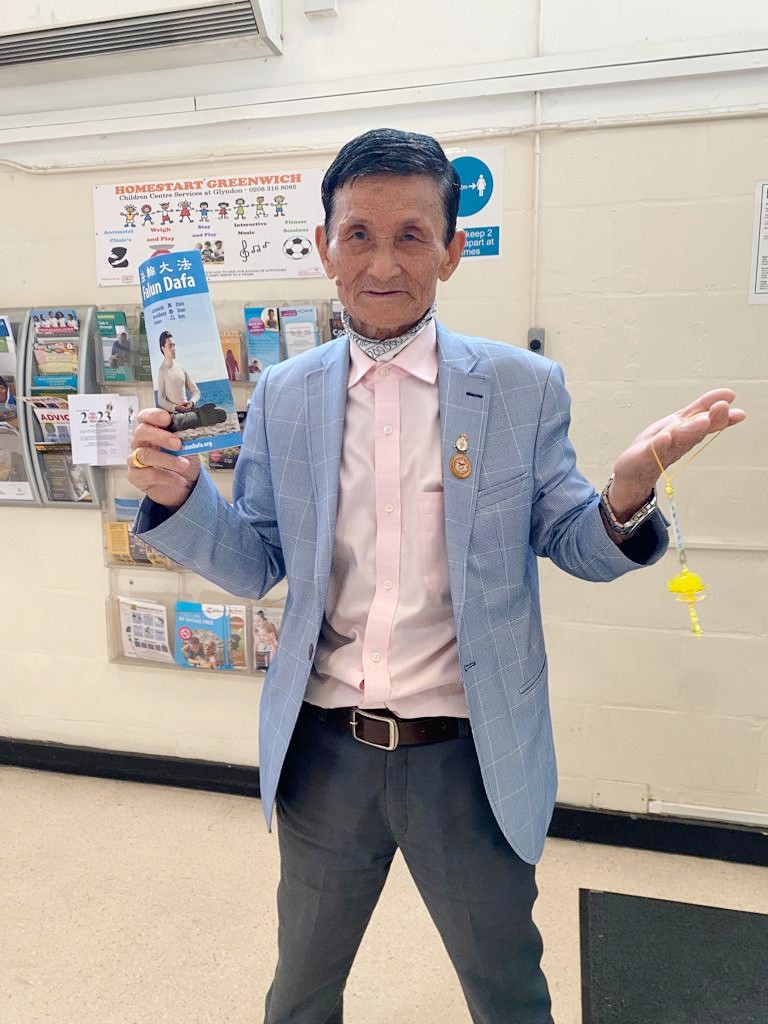 ![]() 图5:胸前佩戴勋章的英国陆军退役军人反复说:“法轮大法好” |