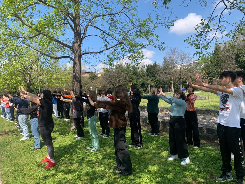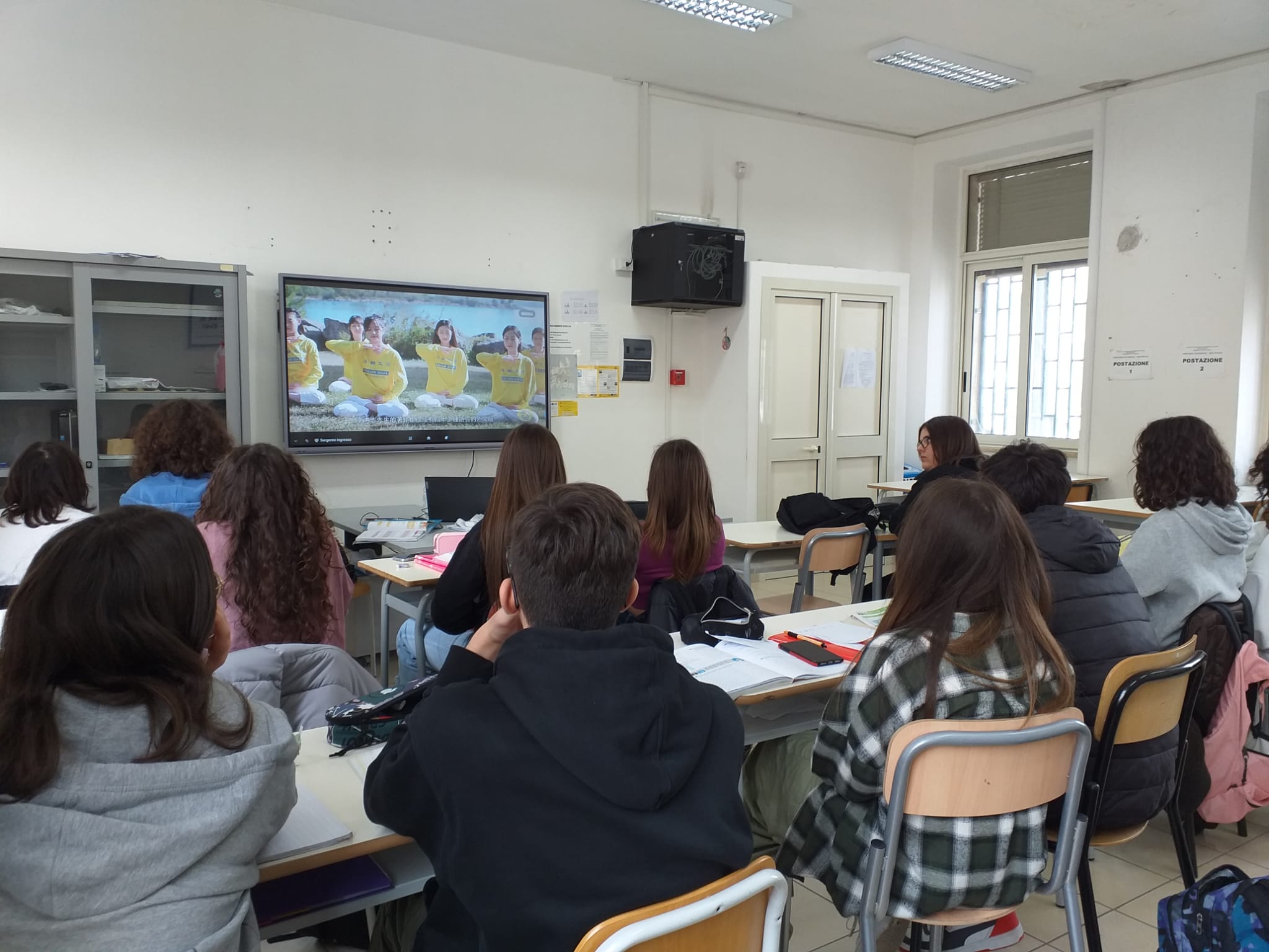 今年(二零二三年)四月,在历时一周的公民教育课期间,MATILDE SERAO高中安排了介绍中国传统修炼⽂化的内容,各科⽼师积极配合在课堂上给学生介绍法轮大法,让学生们观看法弘传全世界各种族受益的盛况。⽼师们还分别带领各班学生来到学校附近市中⼼公园集体学炼法轮功功法。学生们学功表示,⾝体感觉很舒适。
