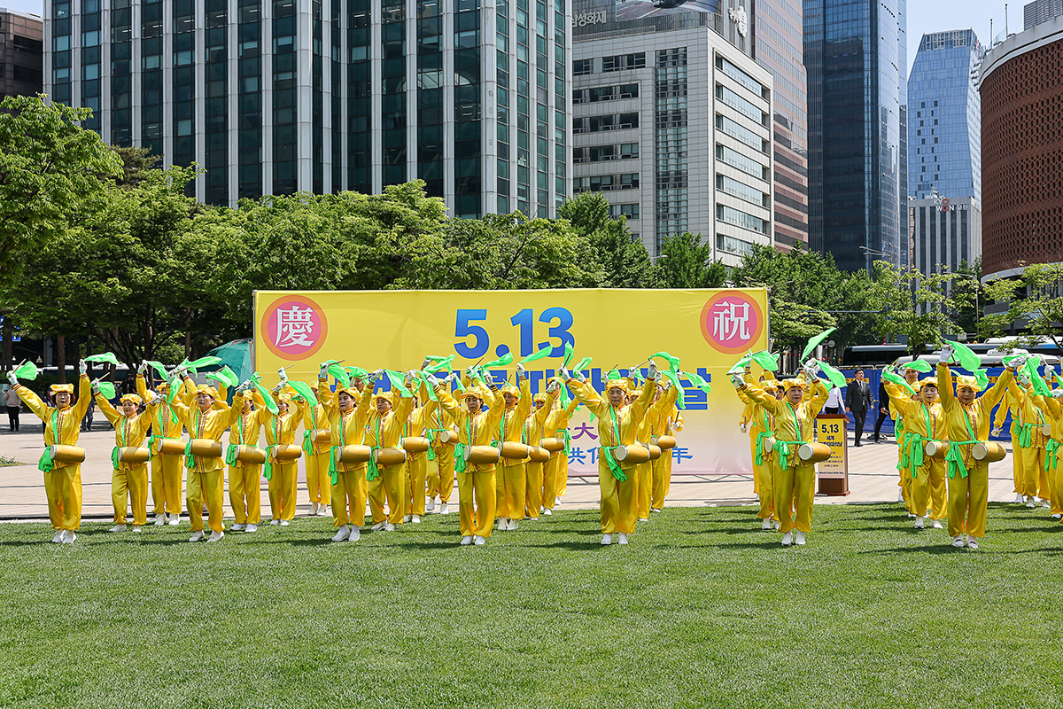 ![]() 图1~3:二零二三年五月八日上午,韩国法轮功学员在首尔市厅前的首尔广场上,以腰鼓队表演及集体大炼功,庆祝五·一三世界法轮大法日和法轮大法弘传三十一周年。 |