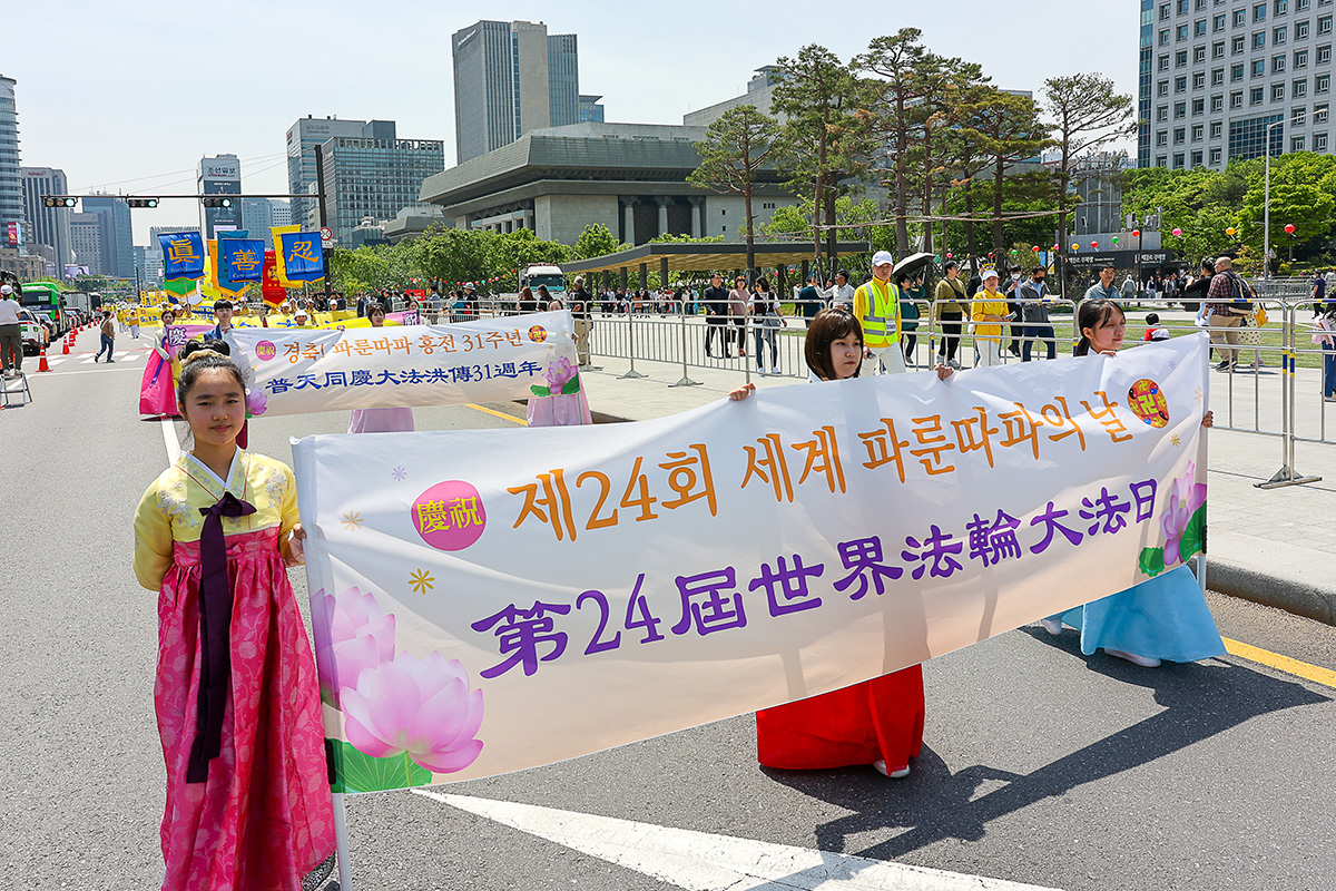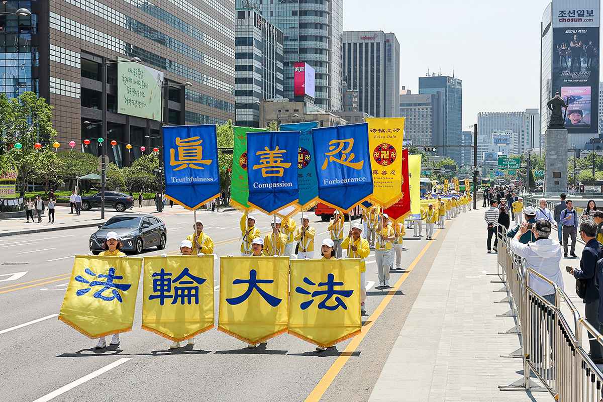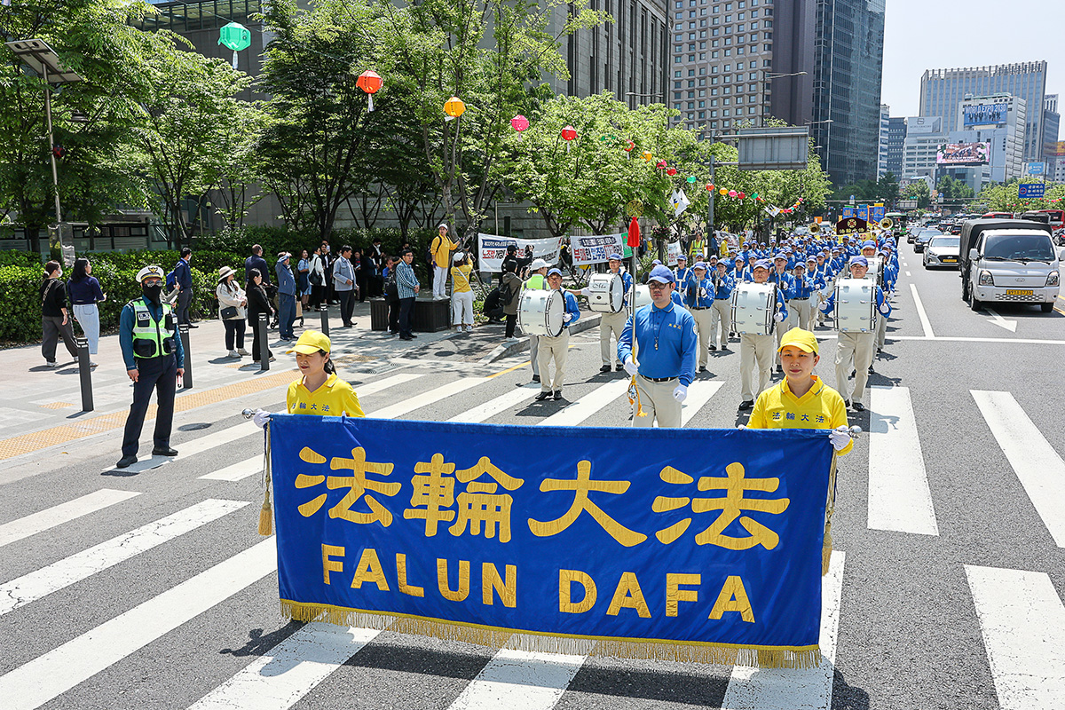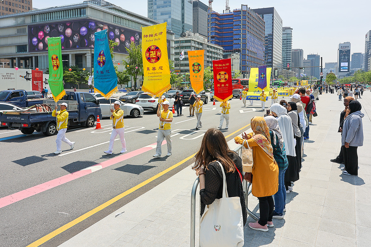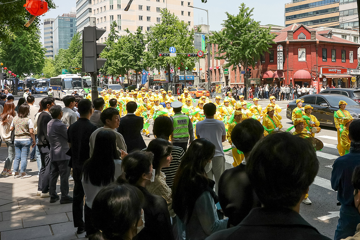 安静祥和的集体炼功结束后,天国乐团开始了明快的演奏。以乐声打头阵,法轮功学员们举着横幅,开始了盛大的遊行,法轮大法修炼书籍——《转法轮》模样的造型花车紧随其后,演奏中国传统小鼓的“腰鼓队”则在末尾作为点缀。恰逢午饭时间,不少市民在外面的街道上散步,直到遊行结束,过程中市民们有的拿着手机拍摄,有的静静观看,有的仔细阅读法轮功学员们分发的传单。不少外国遊客也用手机捕捉在首尔市中心街道上出现的不同寻常的遊行风景。