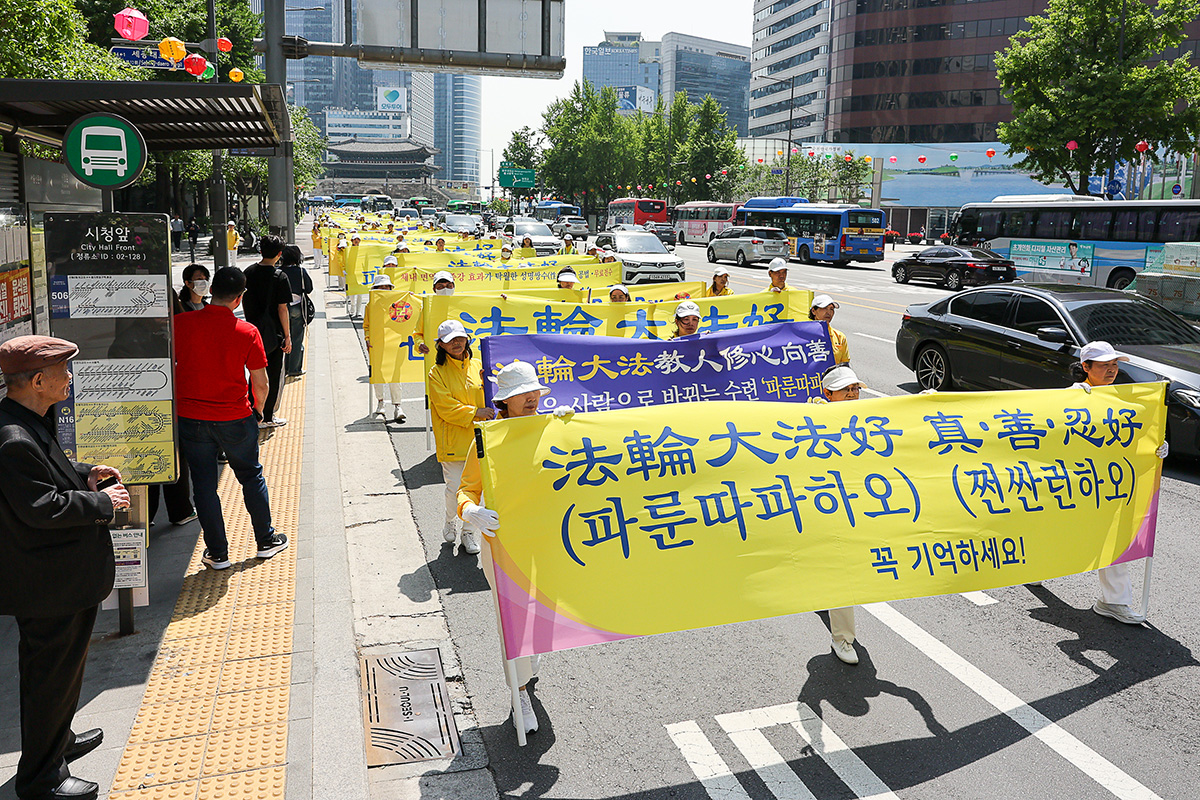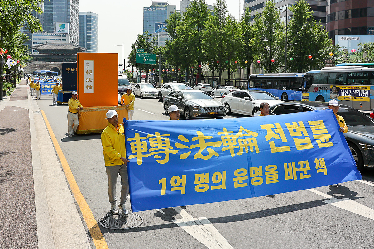 遊行队伍从市厅广场出发,走过钟路光化门、安国交叉路、钟阁、乙支路、南大门等后,再重返市厅广场结束。朴英浩一直跟随队伍遊行直到最后,并在活动摊位前,感激地请走了《转法轮》。