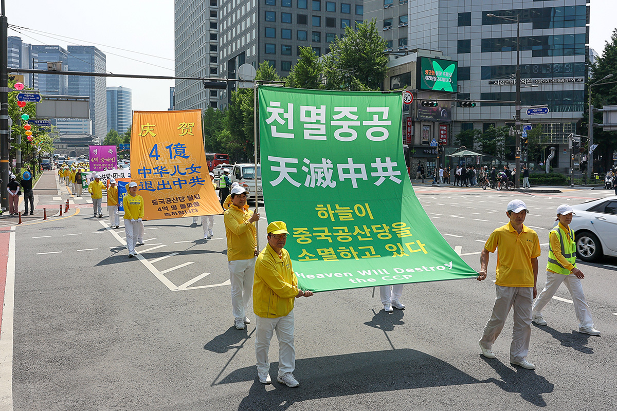 过程中,还有市民跟着队伍一起遊行。朴英浩(四十八岁,安山市)说,“我出生在中国,来韩国之前看到很多人都修炼法轮功。中国共产党迫害人权,应该早点灭亡。”