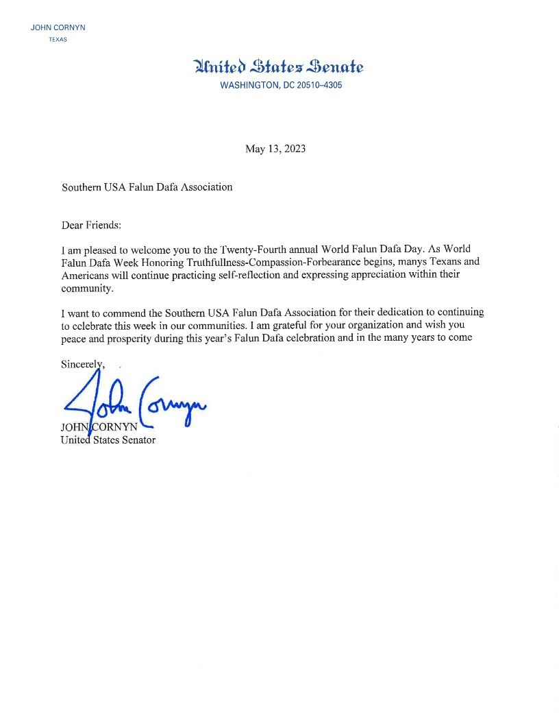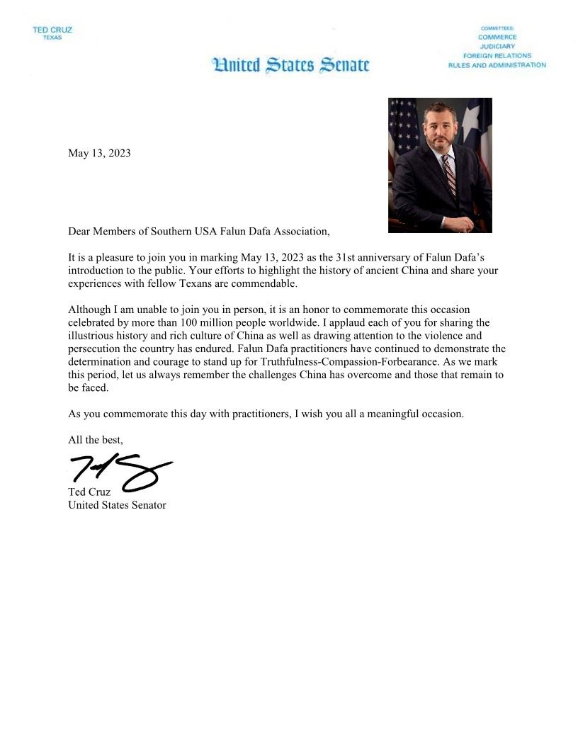 今年的五月十三日将是法轮大法创始人李洪志先生公开传法三十一周年纪念日。美国德克萨斯州的奥斯丁、达拉斯、休斯顿等城市的法轮功学员将于五月十三日(周六)这一天分别在当地举办集体炼功、免费教功活动来庆祝这个特殊的日子。克鲁斯参议员表示:“虽然我无法亲临现场,但是我很荣幸祝贺这个被全球超过一亿人共同庆祝的特别日子。”