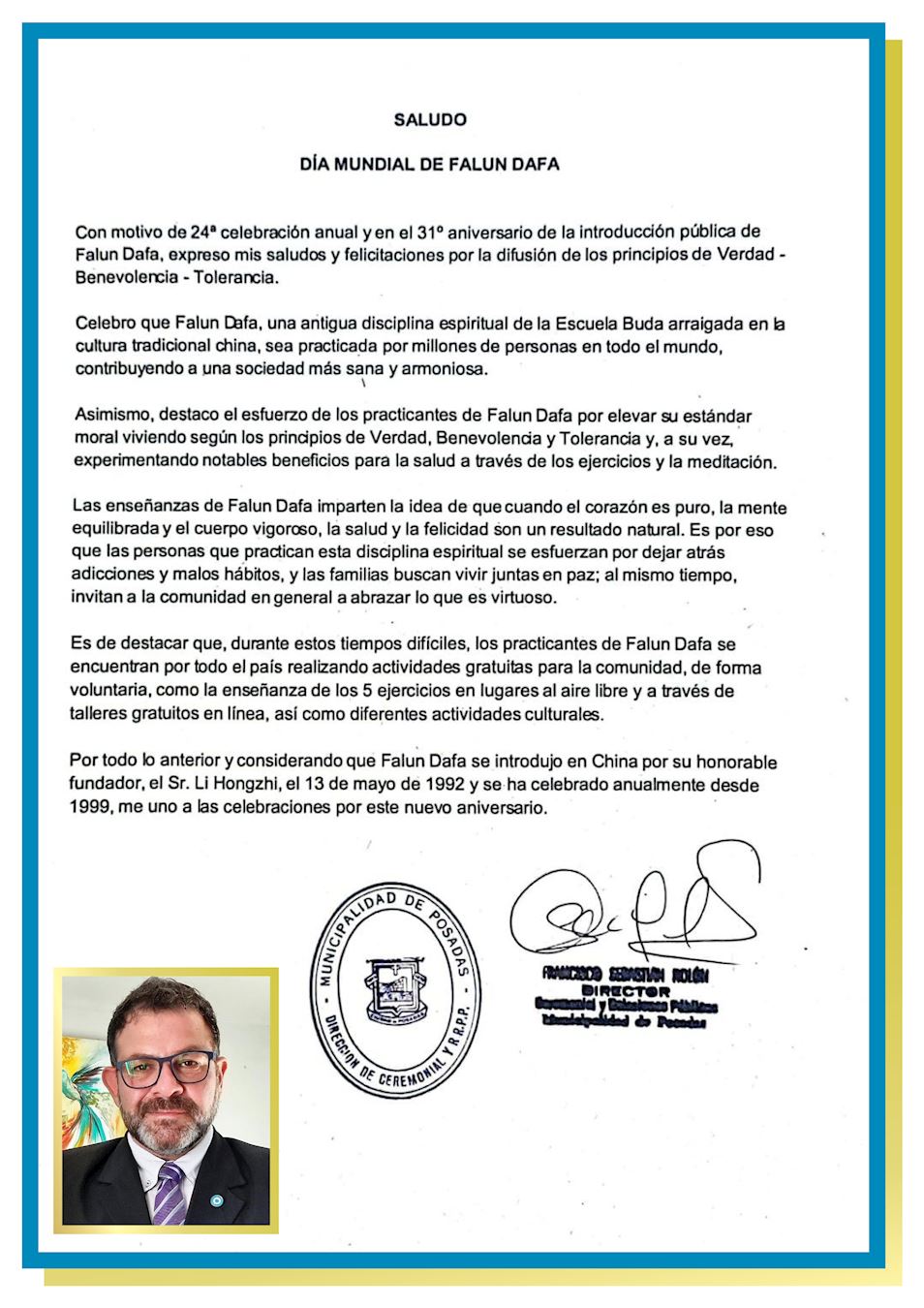 ![]() 图2:庆祝世界法轮大法日,阿根廷北部米西奥内斯省(Misiones)首府波萨达斯的仪式和公共关系主任弗朗西斯科。塞巴斯蒂安-罗隆(Francisco Sebastían Rolón)发贺信。 |
