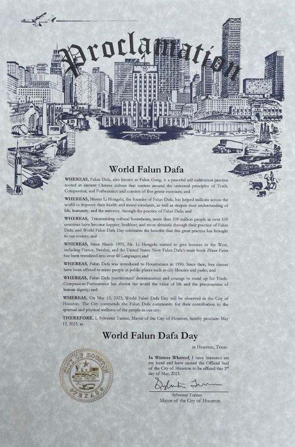 鉴于,二零二三年五月十三日,休斯顿将庆祝世界法轮大法日。市政府借此表彰法轮大法社区对当地民众的身心健康所做的杰出贡献。