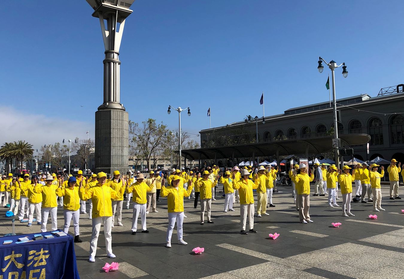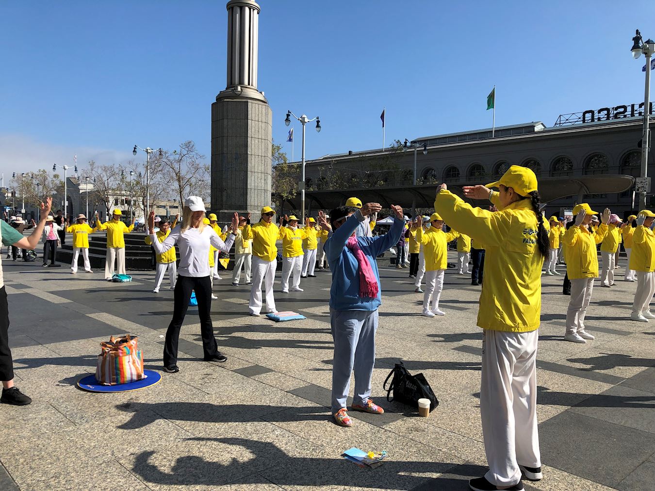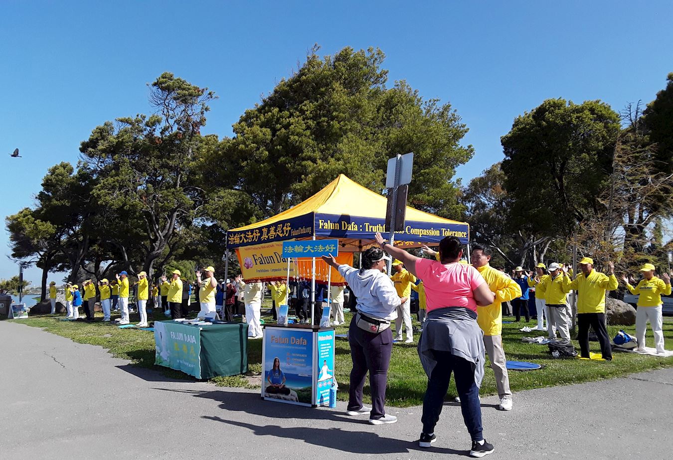 当天的旧金山湾区,风和日丽,渡轮大厦前的广场游人川流不息。许多游客被法轮功学员祥和的炼功场面吸引,驻足观看,纷纷拿出手机拍照,有的与学员交流了解。当得知当日是世界法轮大法日,法轮功是与一九九二年五月十三日由创始人李洪志先生传出,至今有上亿人、在一百多个国家修炼。修炼人以真、善、忍原则为指导,加上炼五套功法,身心受益后,游客们都非常欣喜,不少人表示回去后要多了解,也有的要马上购买大法书《转法轮》,还有的当场学功。