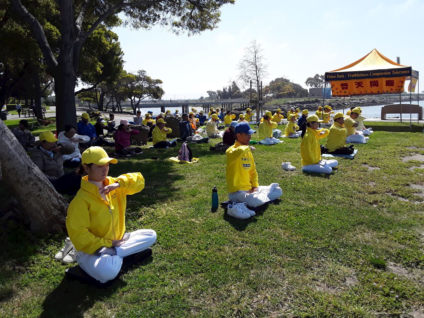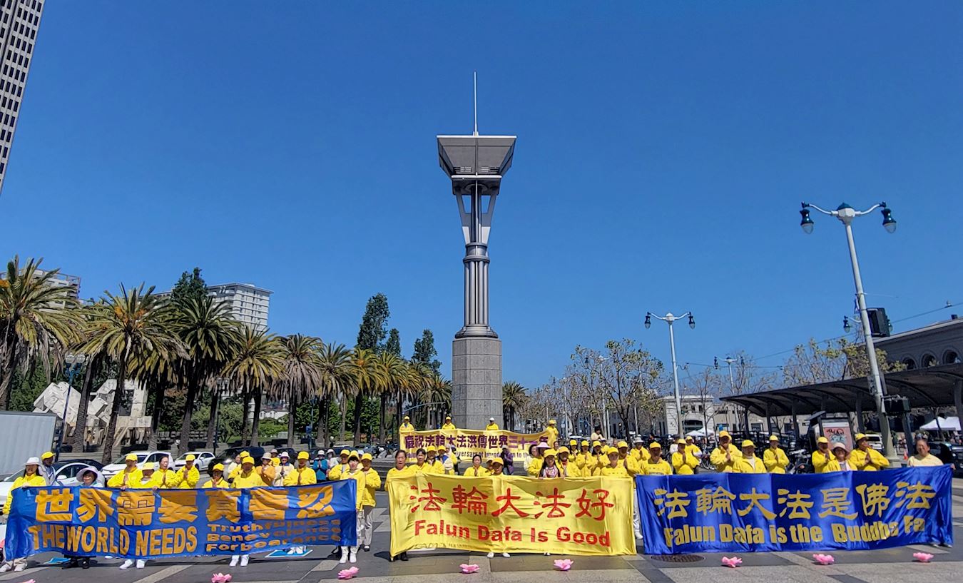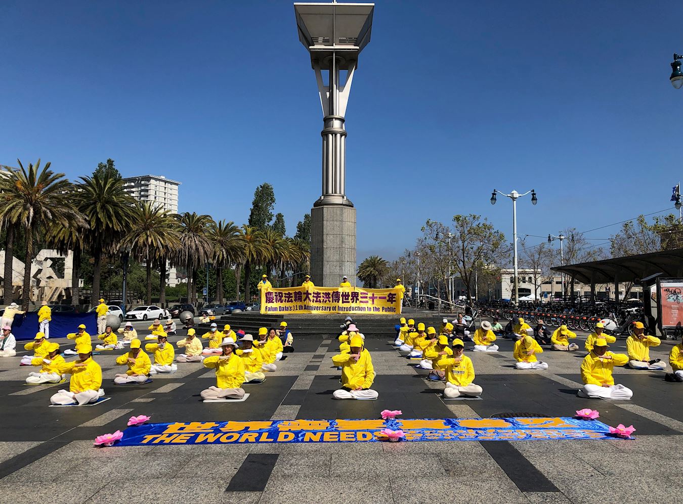 当天的旧金山湾区,风和日丽,渡轮大厦前的广场游人川流不息。许多游客被法轮功学员祥和的炼功场面吸引,驻足观看,纷纷拿出手机拍照,有的与学员交流了解。当得知当日是世界法轮大法日,法轮功是与一九九二年五月十三日由创始人李洪志先生传出,至今有上亿人、在一百多个国家修炼。修炼人以真、善、忍原则为指导,加上炼五套功法,身心受益后,游客们都非常欣喜,不少人表示回去后要多了解,也有的要马上购买大法书《转法轮》,还有的当场学功。