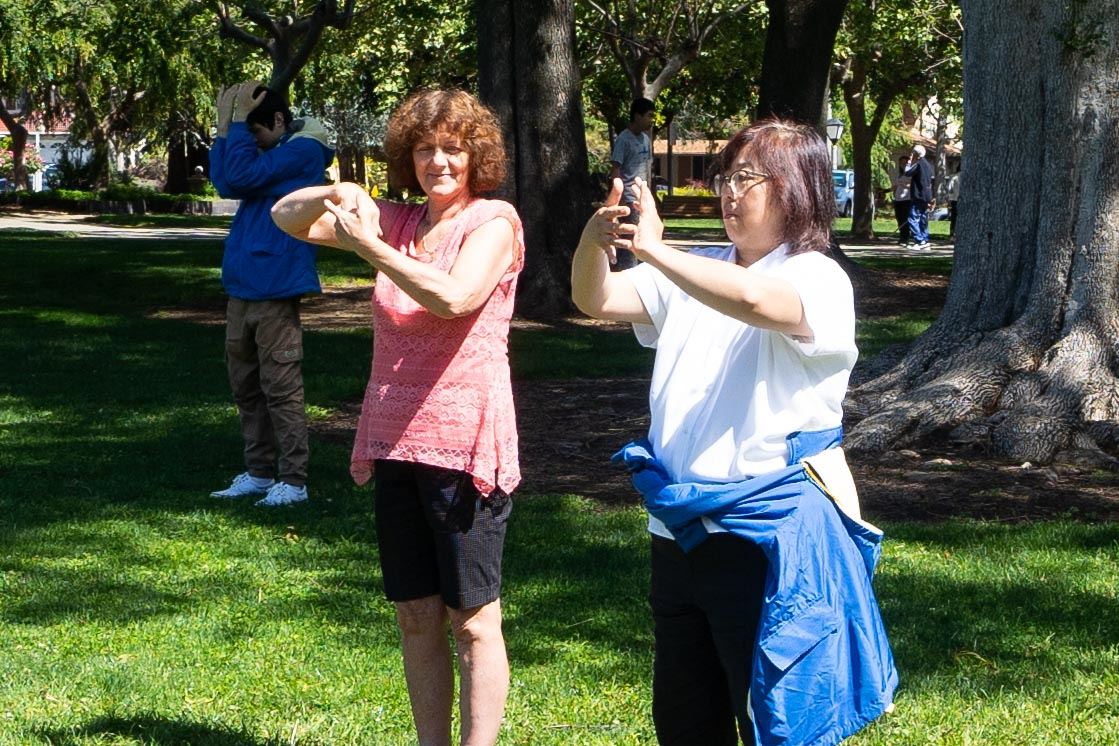 艾伦(Ellen)和玛丽亚(Maria)女士来公园在慢走锻炼,她们被祥和的功法和炼功音乐吸引住了,停下脚步观看。她们表示非常喜欢那种祥和与平和,询问到哪里可以学功。