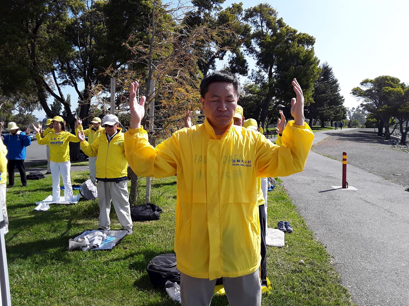 家住旧金山东湾的泽夫·阿门(Zef Amen)当天到旧金山,经过渡轮大厦前的广场,被学员的炼功场面吸引,与学员交谈良久,询问法轮功是什么。当他了解到,法轮大法与其它功法的不同之处在于修心,首先按照真、善、忍做个好人,炼功后才起作用,才会有能量,他非常认可。学员告诉他,法轮功的主要著作《转法轮》已被翻译成四十多中语言,这本书是指导修炼的,在网上可以免费看,他马上想要买书看,并问什么地方可以买到。学员留下了他的电话,表示会把买书的网站发给他,他非常高兴。当得知李洪志师父给学员调整身体,却不收学员一分钱时,他非常感动。学员告诉他:“今天是法轮大法日,也是我们师父的生日。”他双手合十表示祝贺。