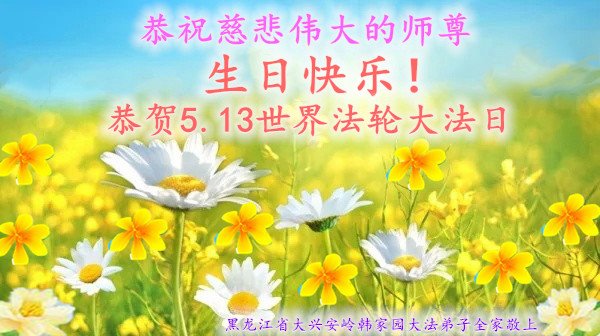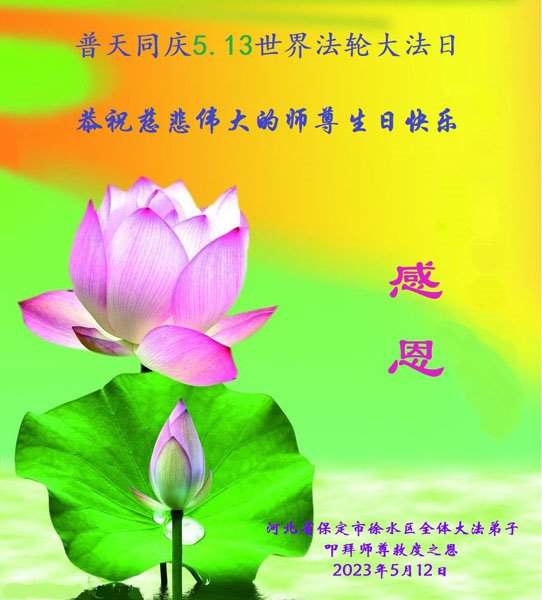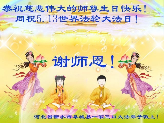 慈悲伟大的师父好,我九岁时就跟随着妈妈学大法。在邪恶疯狂时期,我和妈妈一起配合发资料,写标语、贴标语、挂条幅。在妈妈多次被抓、被关押期间,我没有动摇信念。至今我坚信师父、坚信大法,我非常珍惜师父赐予的“正法时期大法弟子”的神圣称号。我生逢在师父传宇宙大法时期,万分感谢师父的伟大赐予,这是我生生世世的期盼,这是我来到人世的夙愿。在普天同庆的日子里,我怀着虔诚的心感恩师父,这是无法用人类语言来表达的心境。天地同庆,万物感恩,颂歌献给师父:谢谢师父的慈悲关怀,祝师父生日快乐!祝大法洪传三十一周年!
