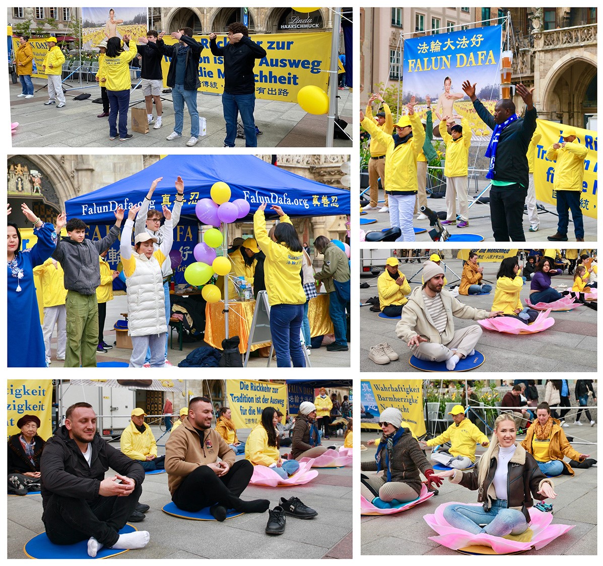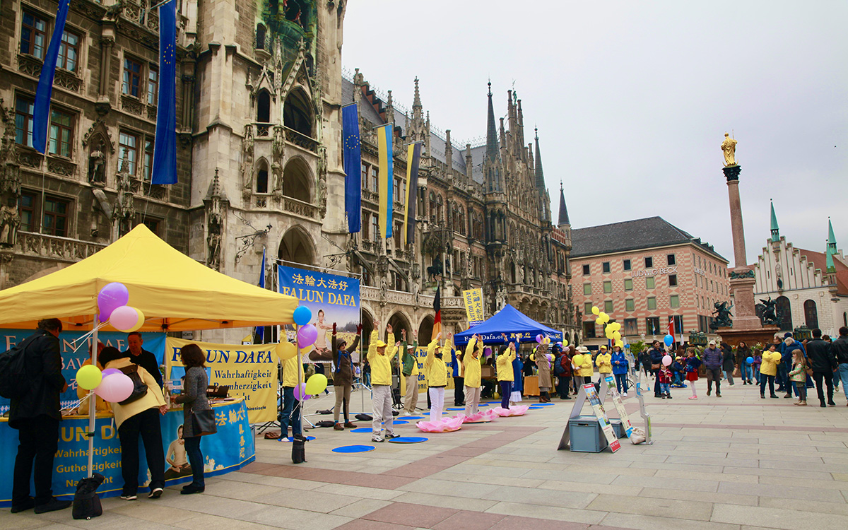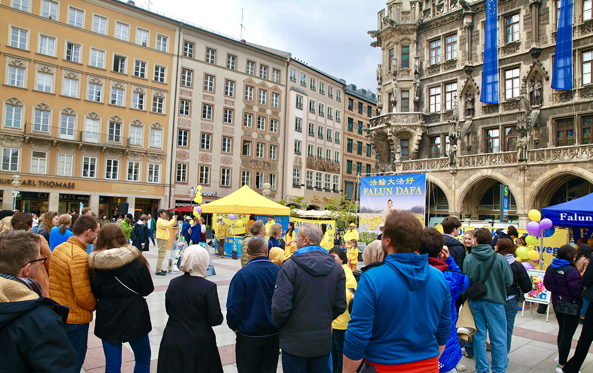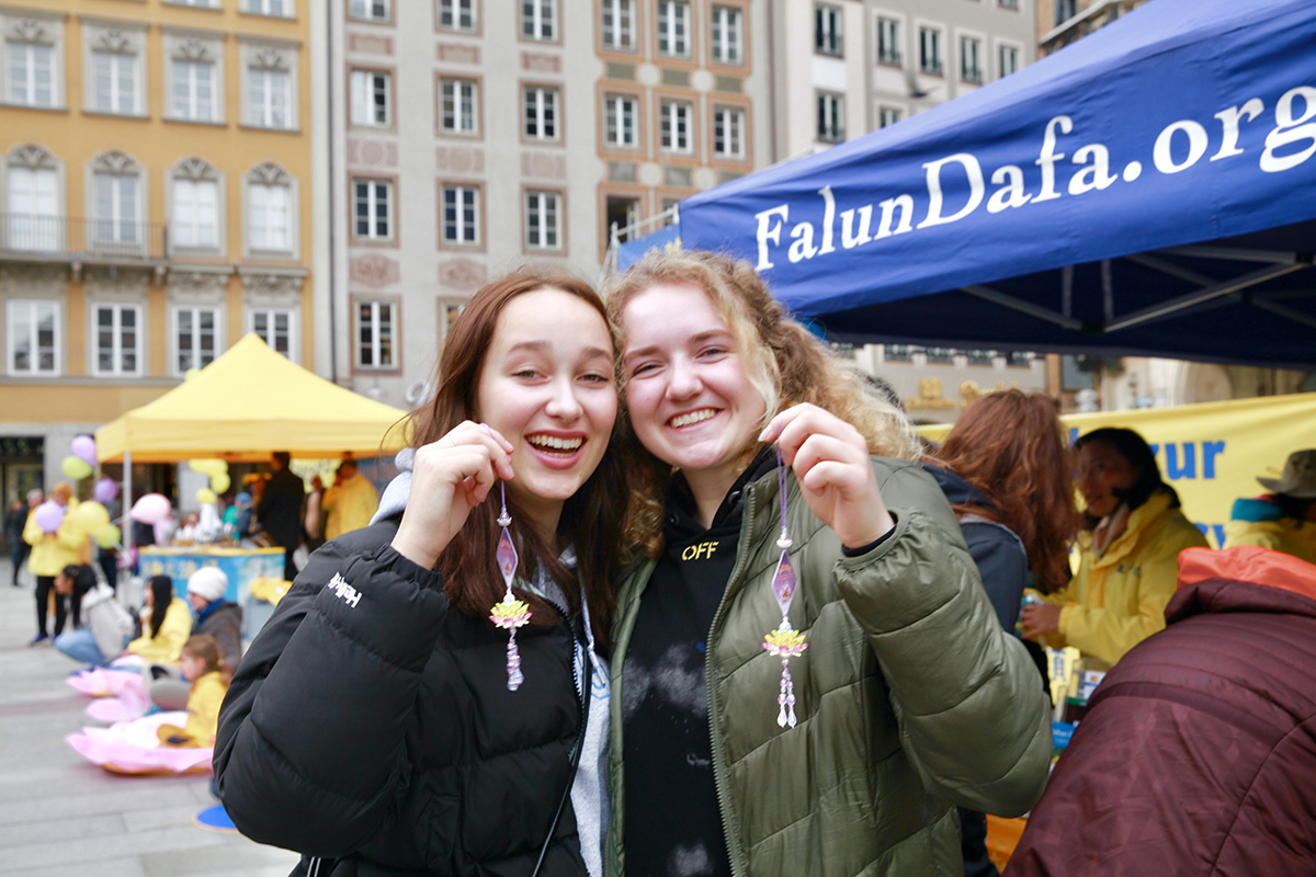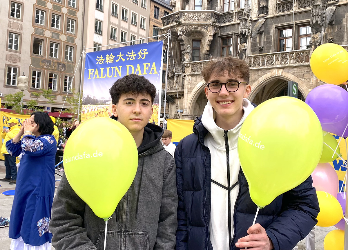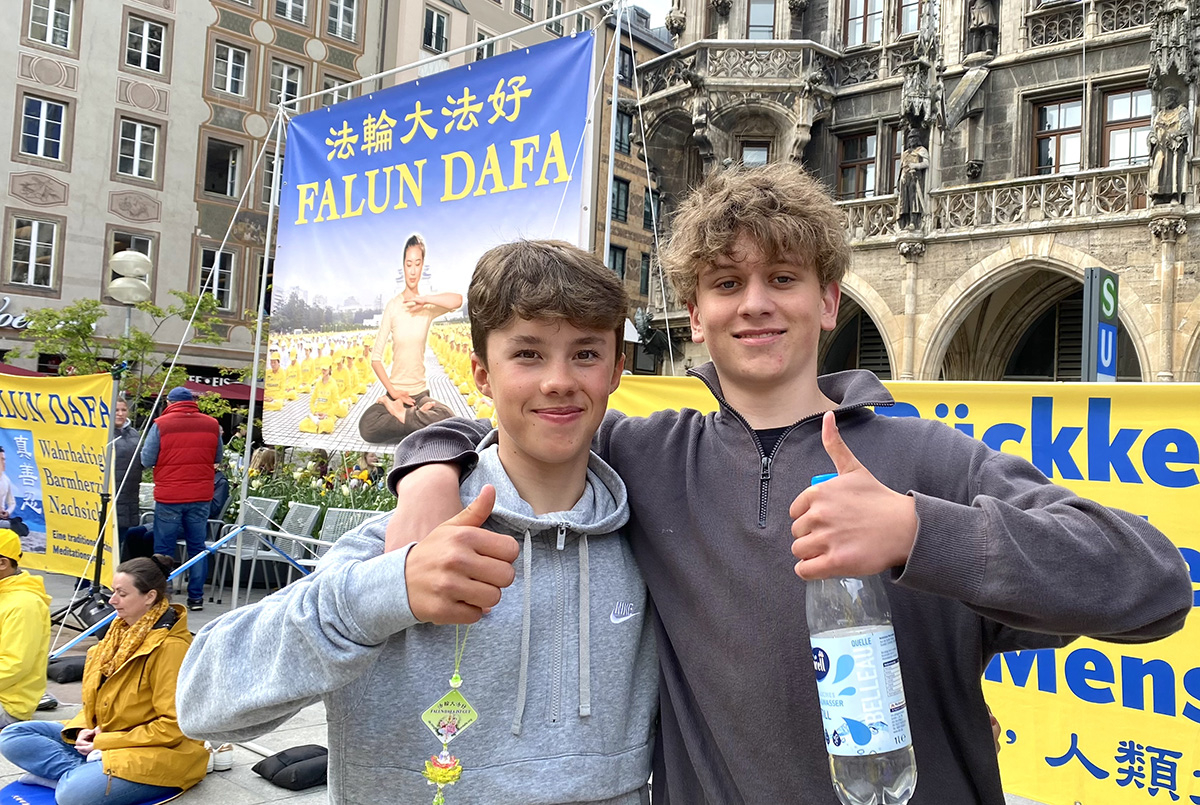 中学生施密特(Schmitt)和瓦伦汀(Valentin)路过慕尼黑玛利亚广场,看到法轮功学员在打坐,他们也跟着尝试了一会儿。他们觉得当经过糟糕的一天之后,炼功能让他们感觉得到很大的抚慰。