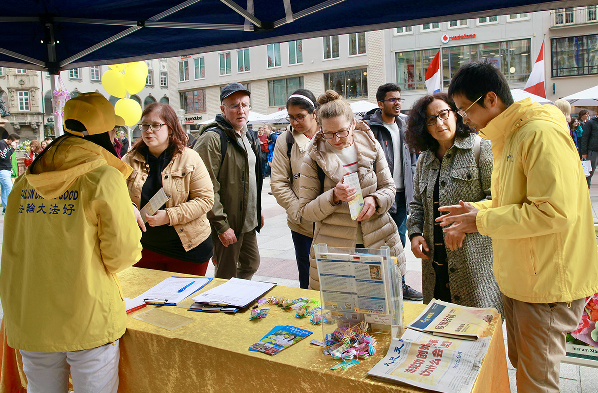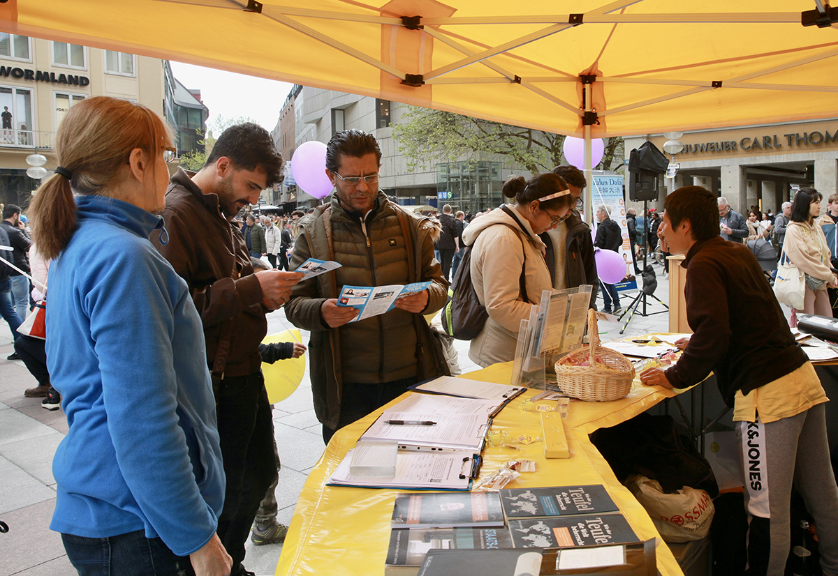 慕尼黑广场一如既往,人来人往,熙熙攘攘。当天广场上有很多中国留学生、大陆参展人员和游客路过,他们中大多都在拍照和录像,很多人来咨询,有的拿了资料和李洪志先生新近发表的《为什么会有人类》、《为什么要救度众生》两篇经文,还有的当场退出中共各种组织。一位留学生主动来展位了解真相,表示在国外感到轻松,他还想知道在哪里可以学炼法轮功。他和伙伴跟学员交谈之后,当场退出了中共共青团。
