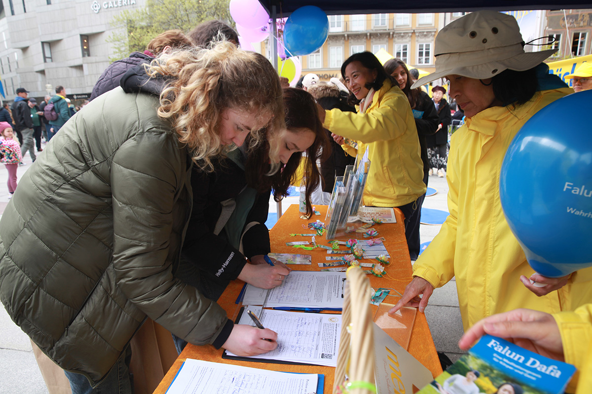 很多人看到法轮功学员炼功场景,被深深吸引,不少人、特别是年轻人,纷纷学着法轮功学员的动作炼功。他们表示,一起炼功感觉非常好,气氛祥和。也有不少人签名声援法轮功学员反迫害。德国年轻人三三两两的加入炼功行列,认真尝试法轮功功法。他们通过炼功,感到心安静了下来。