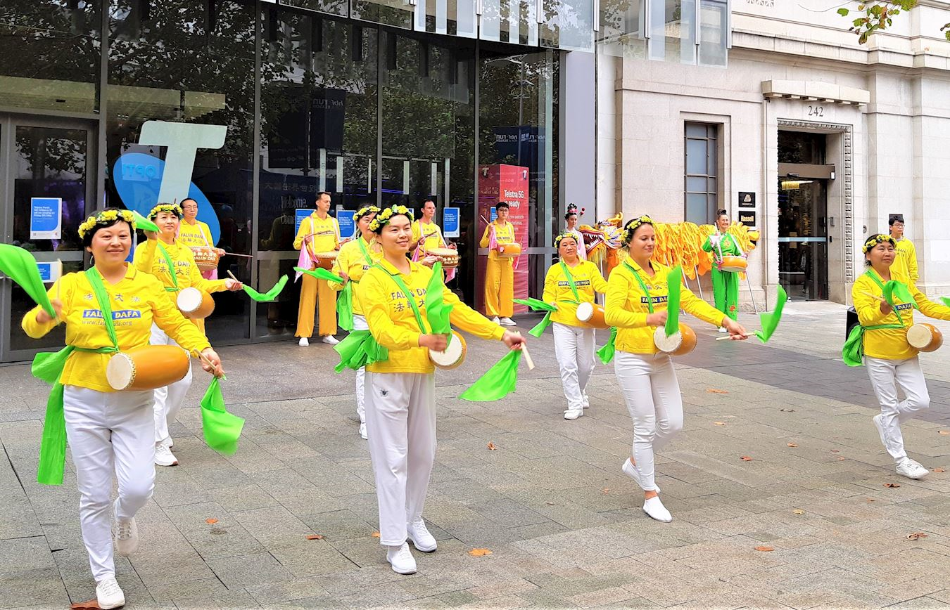 当天活动中,法轮功学员演示五套功法,向民众介绍法轮功,分享真、善、忍的美好。由法轮功学员组成的腰鼓队和舞龙队喜气洋洋的精彩表演,赢来众多路人的掌声和赞美。民众欣喜的接过真相传单和小莲花挂饰,孩子们举起印有“法轮大法好”的彩色气球,大街上洋溢着祥和喜庆的气氛。