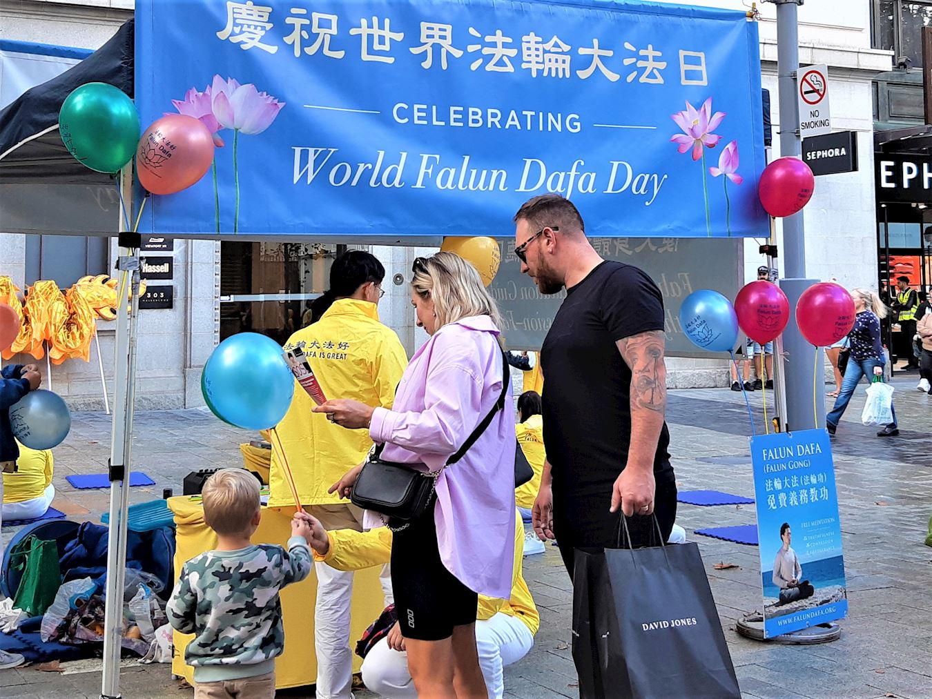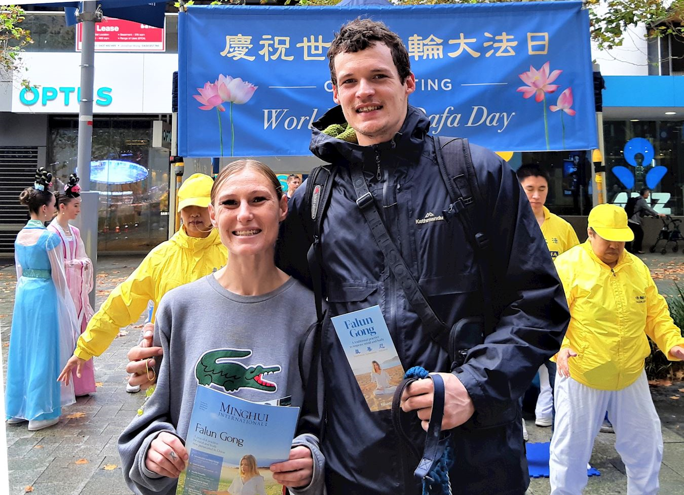安柏·麦凯格·史密斯(Amber McKegg-Smith)和她的未婚夫米切尔·亨特(Mitchell Hunter)路过活动现场,感受到祥和美好的能量,了解到法轮功真、善、忍的原则,为之深受感动。