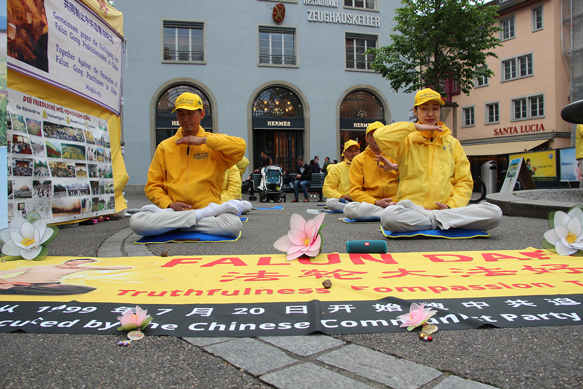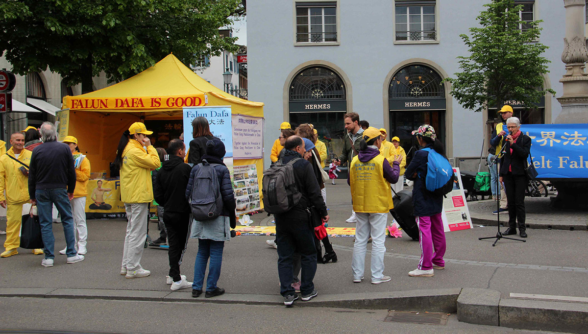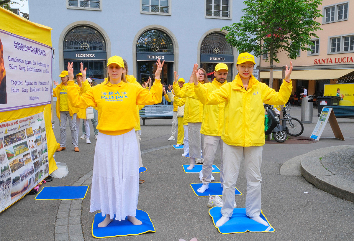 当天,法轮功学员在瑞士最大的城市苏黎世市中心的军械库广场(Zeughausplatz)庆祝第二十四届世界法轮大法日。学员们随着祥和的音乐展示五套功法,同时通过演讲讲述法轮功的真相,向路人介绍这个普天同庆的节日。展出的展板和横幅吸引很多人驻足观看,有的向学员询问,了解更多讯息。