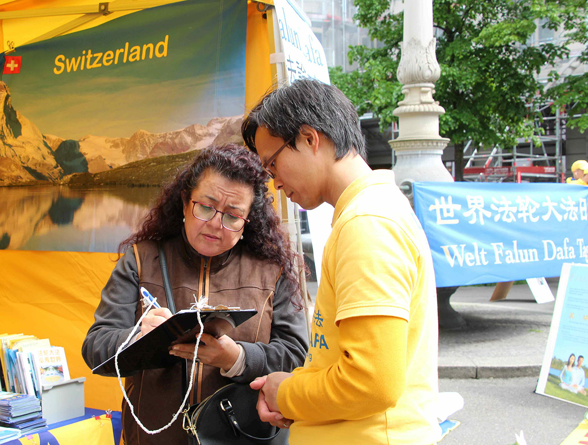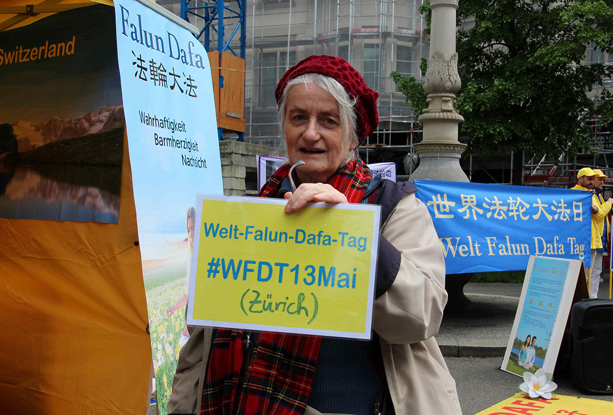 退休前从事护士工作四十多年的加布里埃尔·斯普雷特(Gabriele Spreter)曾经多次看到过法轮功学员在苏黎世的各种活动,所以法轮功对她而言并不陌生。她谈到:“法轮大法给我的感觉很好,我是基督徒,但我觉得与法轮功学员就如家人一般。”