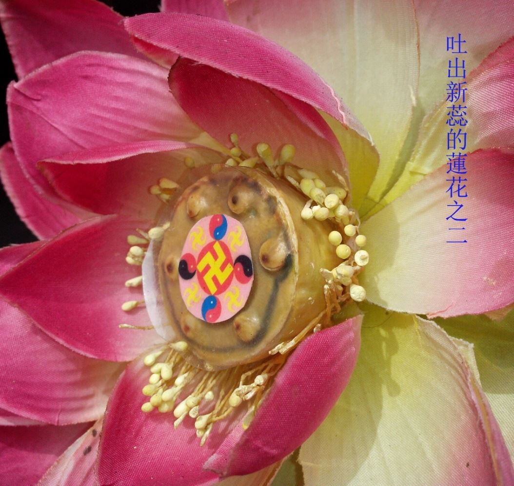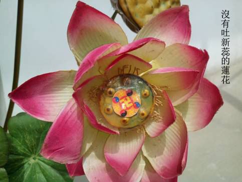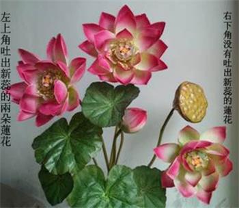 这莲花是一九九五年买的。我上街买了两枝莲花敬献师父。它是用尼龙布做的,每枝莲花上有三朵开放的粉色莲花和一个莲蓬、几片绿叶,莲花中有细细的黄色花蕊,很好看。我把两枝莲花分别插入两个小花瓶,供奉在楼上大厅师父的法像前。
