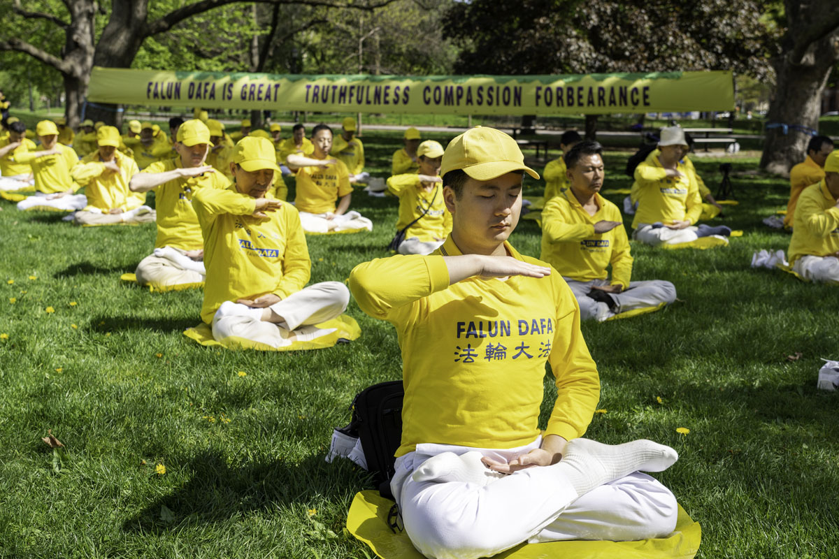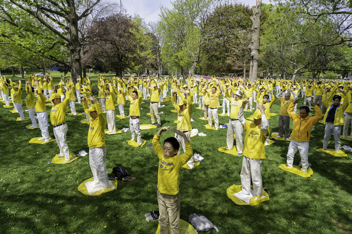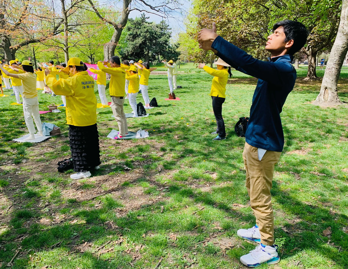 普拉纳福(Pranav)来自美国密苏里州圣路易斯市,在多伦多就读高三。看到金色阳光照耀下在草坪上炼功的学员们,他被吸引,并驻足加入,当时学员们正在炼第二套功法,他抬起自己的臂膀,模仿着学员们做完了第二套功法。