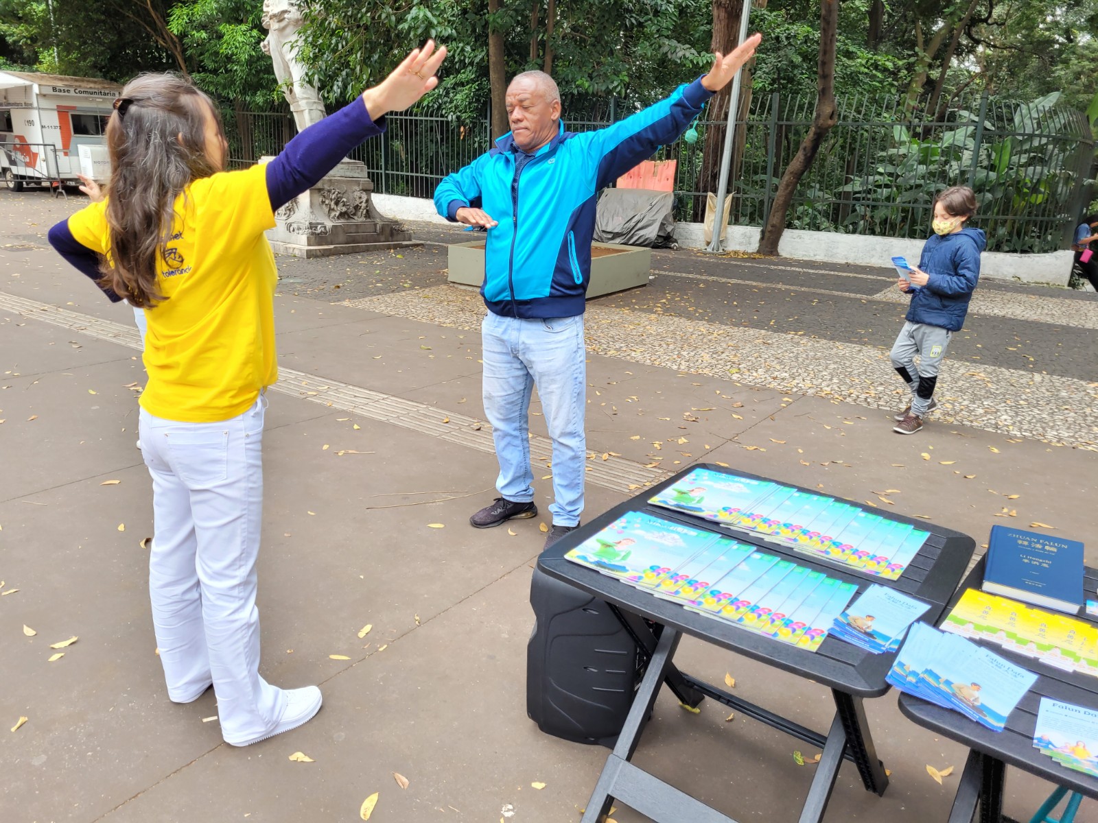 今年五十岁的埃瓦尔多·费雷拉·多斯·桑托斯(Evaldo Ferreira dos Santos)是一位司机,他说两年前就听说过法轮大法了。这次他来到活动现场,当即开始学炼五套功法。