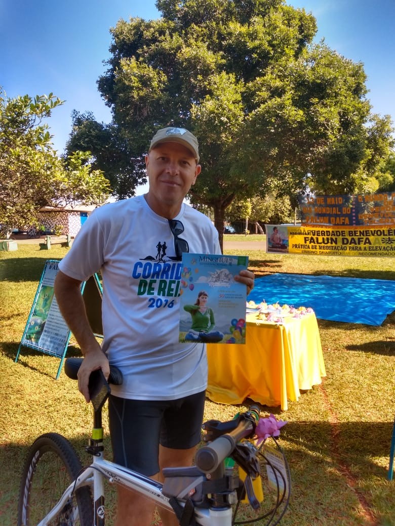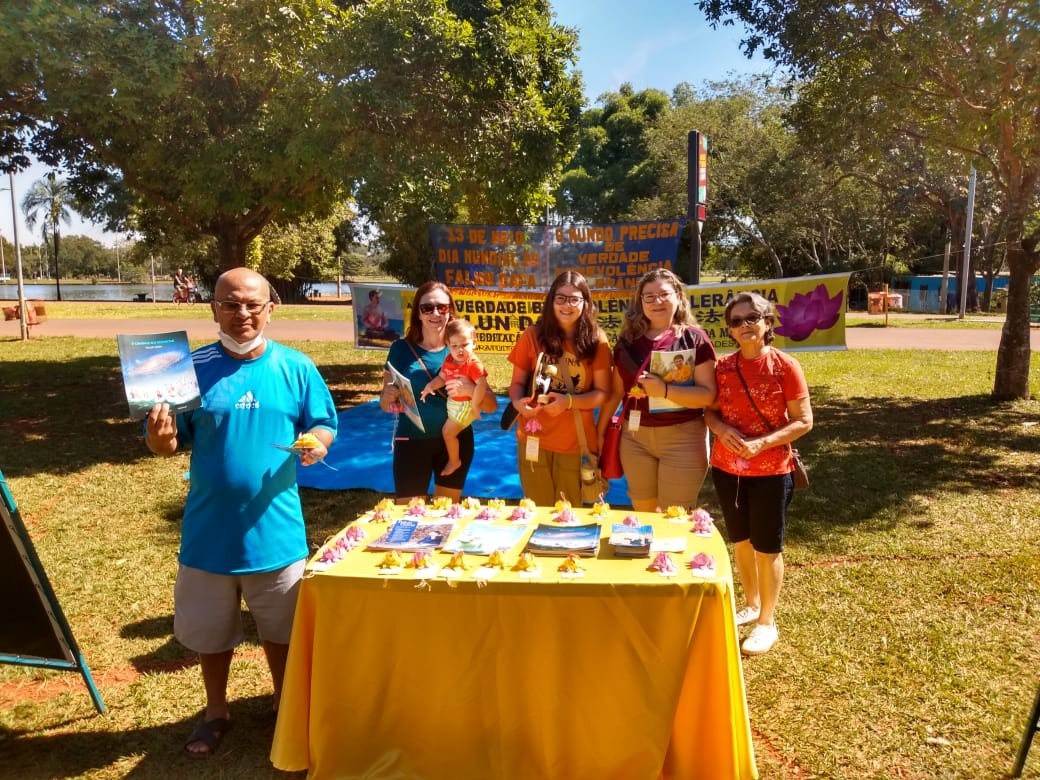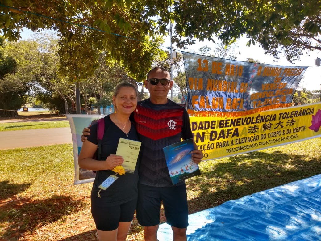 来自马托格罗索州的小伙噶布利艾(Gabriel)看完展板后很感兴趣,询问了许多问题:什么是法轮大法?都有什么内容?网上的联系地址等等,他听得很认真,表示要上网学习大法。虽然他的工作需要在两地不断来往,但是他说,在首都时,会来公园与学员一起炼功。最后,他对法轮大法日表示了祝贺。