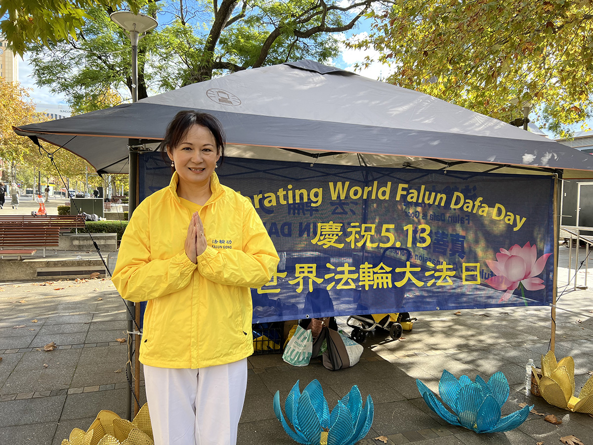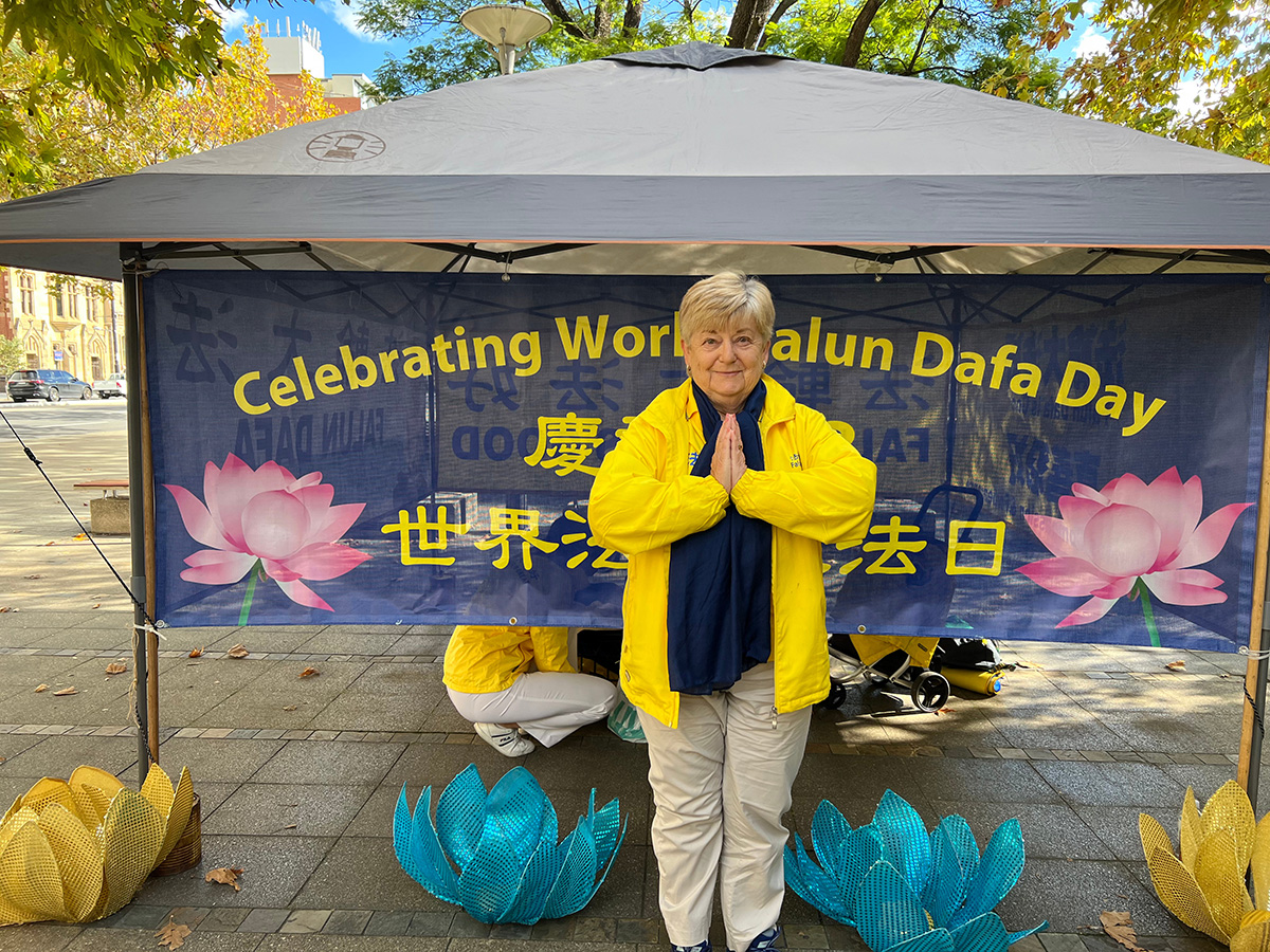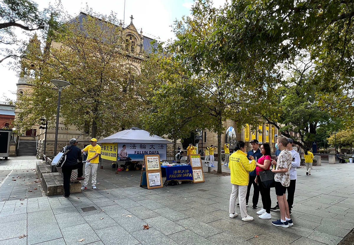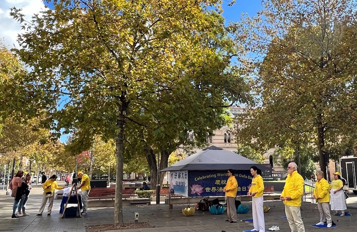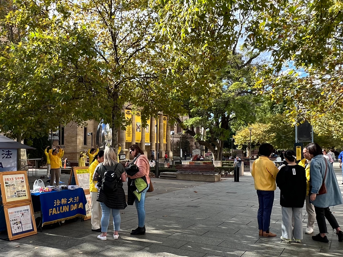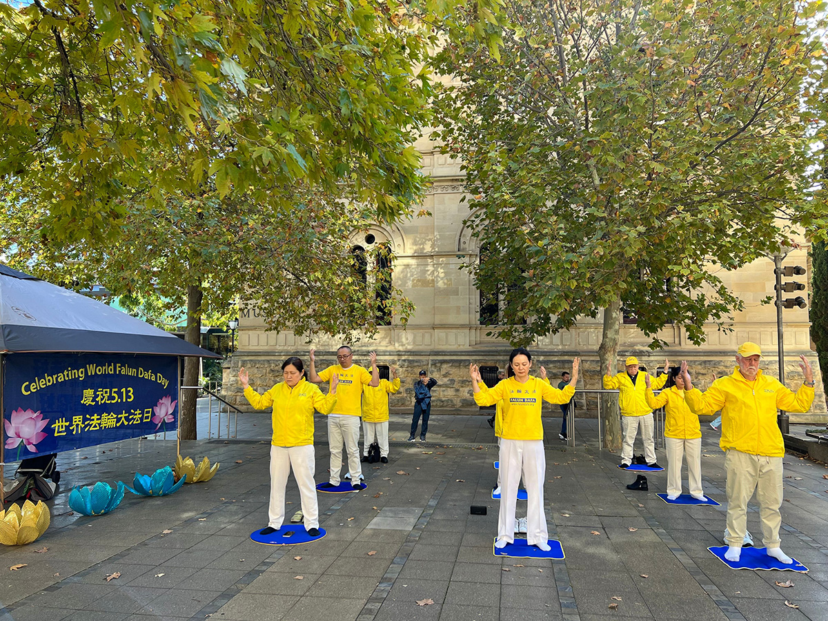 二零二三年五月十三日当日,进入金秋的南澳阿德莱德一扫几日的阴雨寒冷,天气格外晴朗温暖,部分法轮功学员在阿德莱德文化中心北大街(North Terrace)集体炼功,向民众分享大法美好、庆祝世界法轮大法日的喜悦。